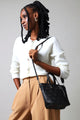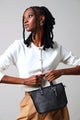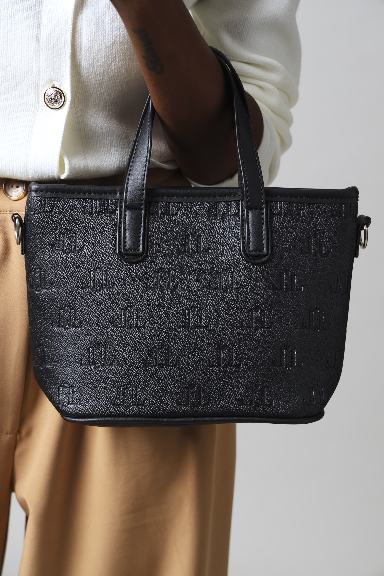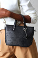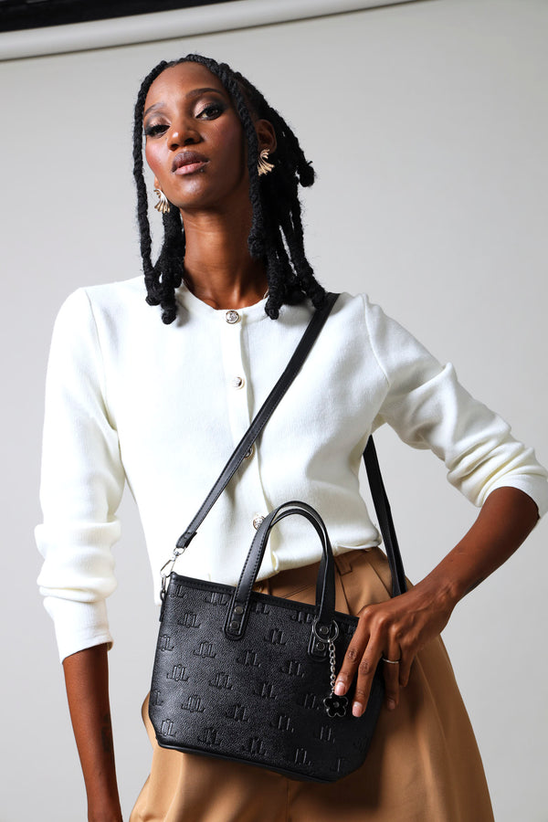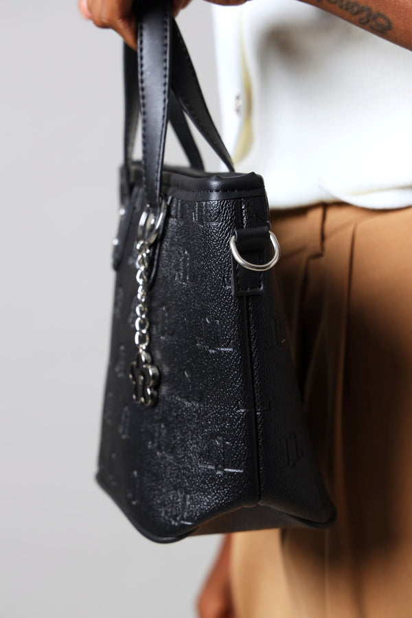 A sophisticated black tote featuring personalized embossed monogramming and an elegant epoxy flower charm. Perfect for those who appreciate refined details and timeless style.
