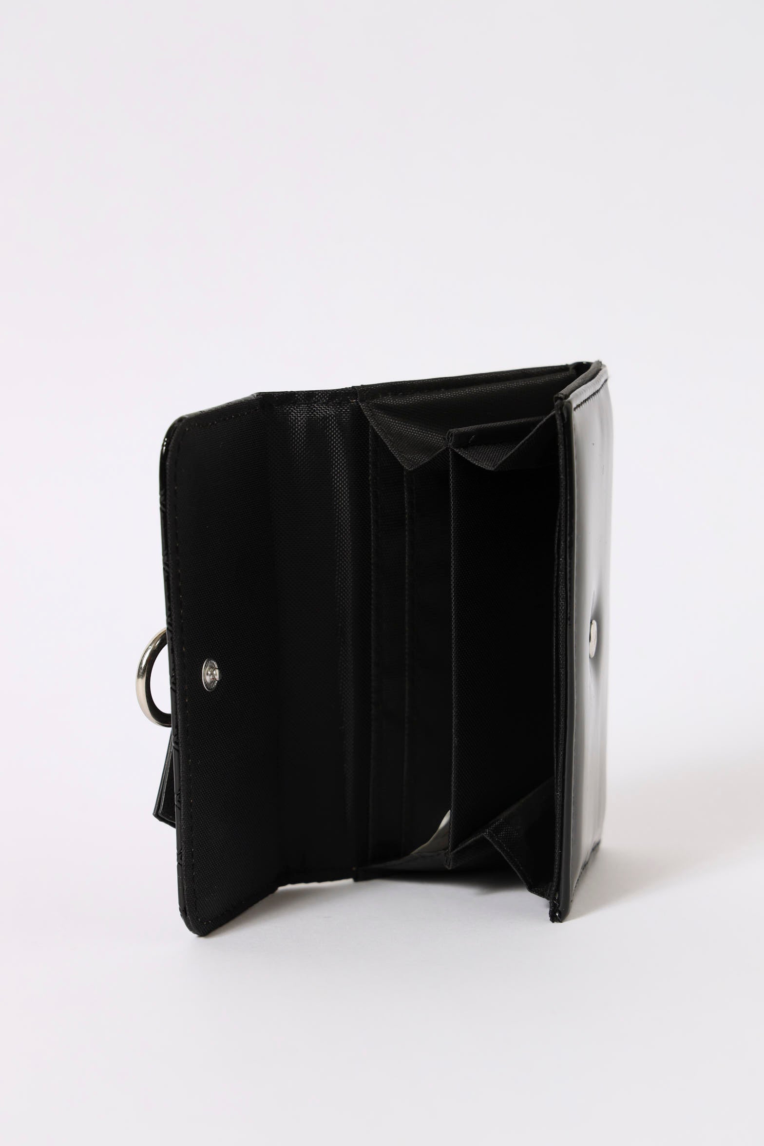 Carry your essentials in style with this chic flapover wallet featuring an embossed monogram design. The sleek black and silver colorway pairs perfectly with any outfit, while the metal charm detail adds a touch of personality. Multiple card slots and a spacious interior keep your cash, cards, and coins organized on the go. Whether you're heading to brunch or a night out, this compact wallet is the perfect accessory to show off your unique flair.