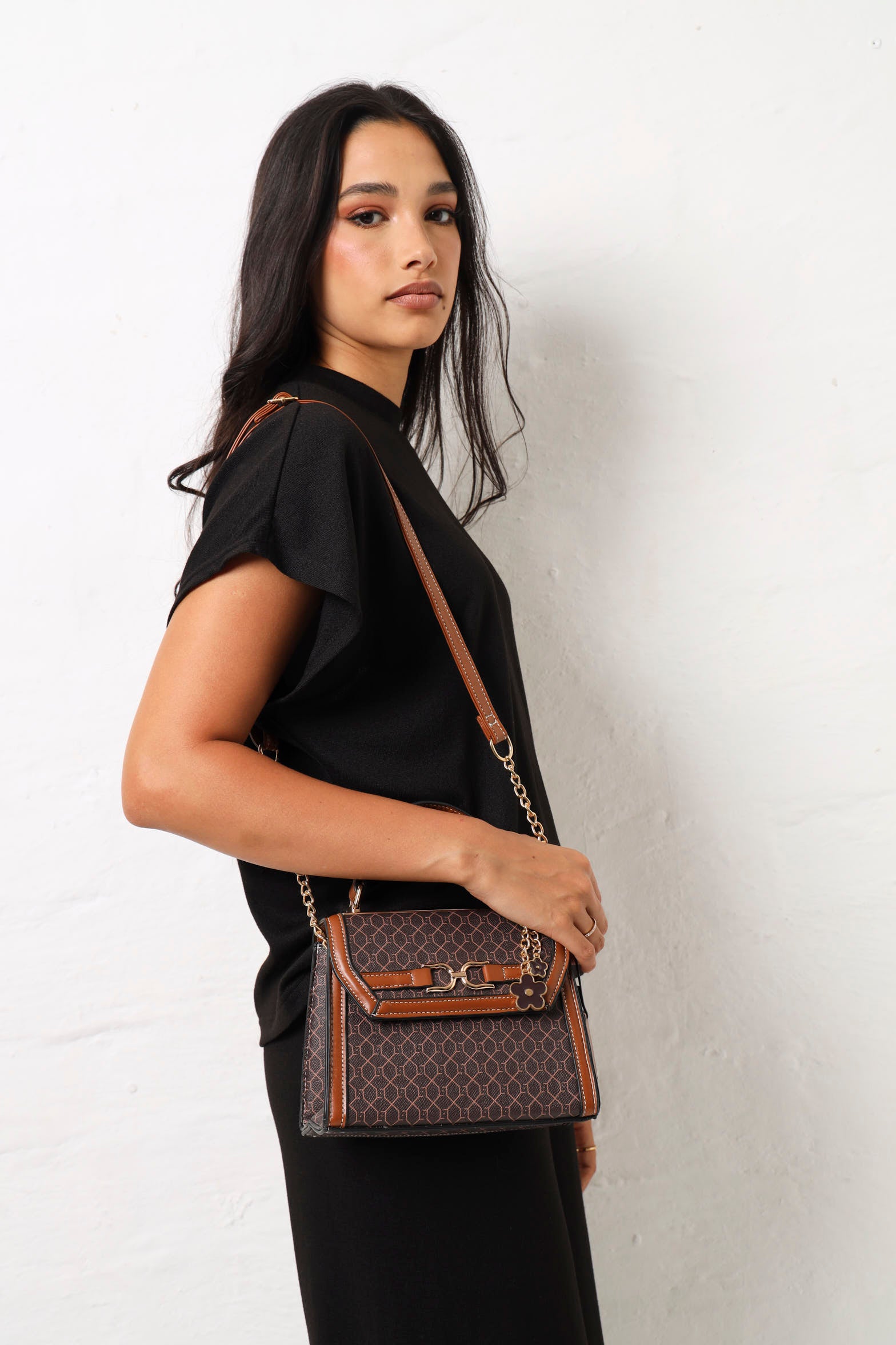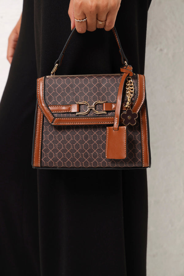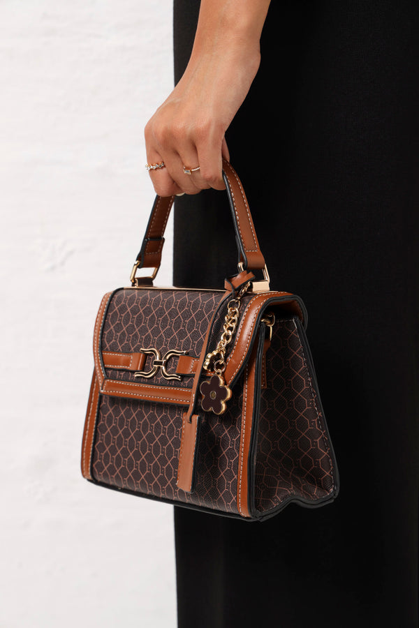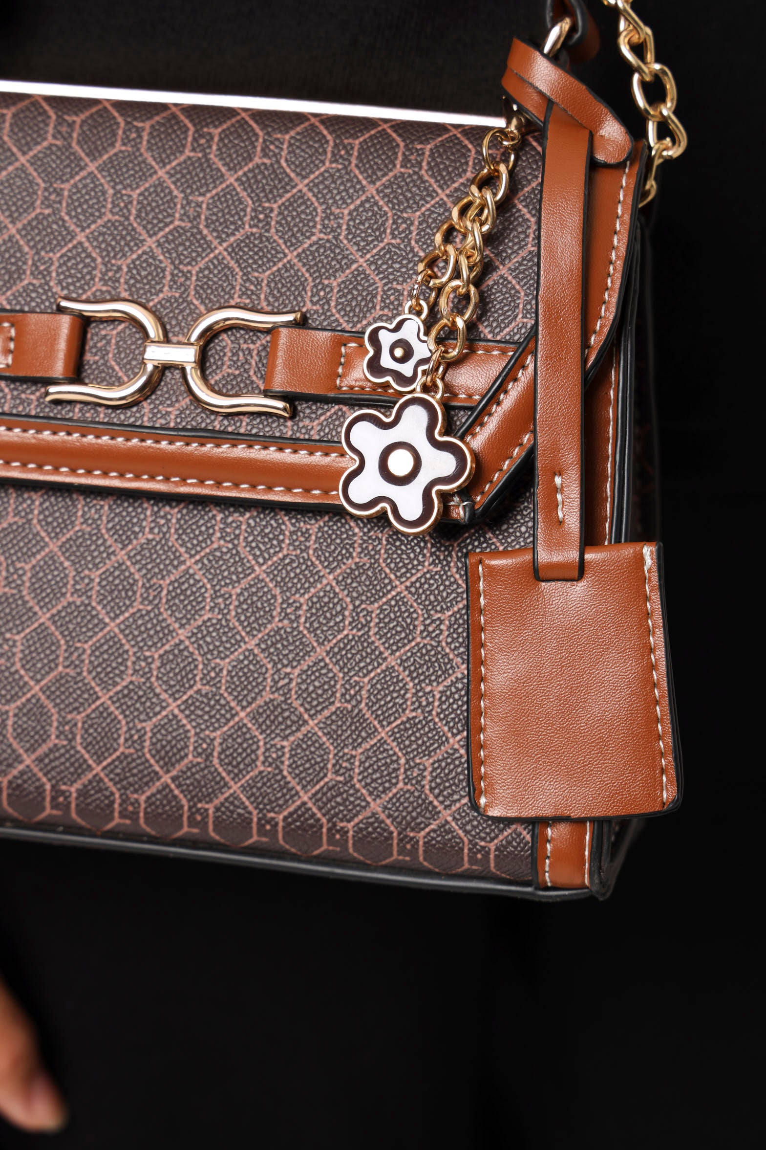 Carry your style with a flourish! This charming brown satchel features an embossed monogram that's uniquely yours, paired with delightful multi-flower charms that add personality to every outing. The structured silhouette keeps your essentials organized while the playful details make a statement. Perfect for those who believe accessories should spark joy and conversation wherever you go.