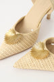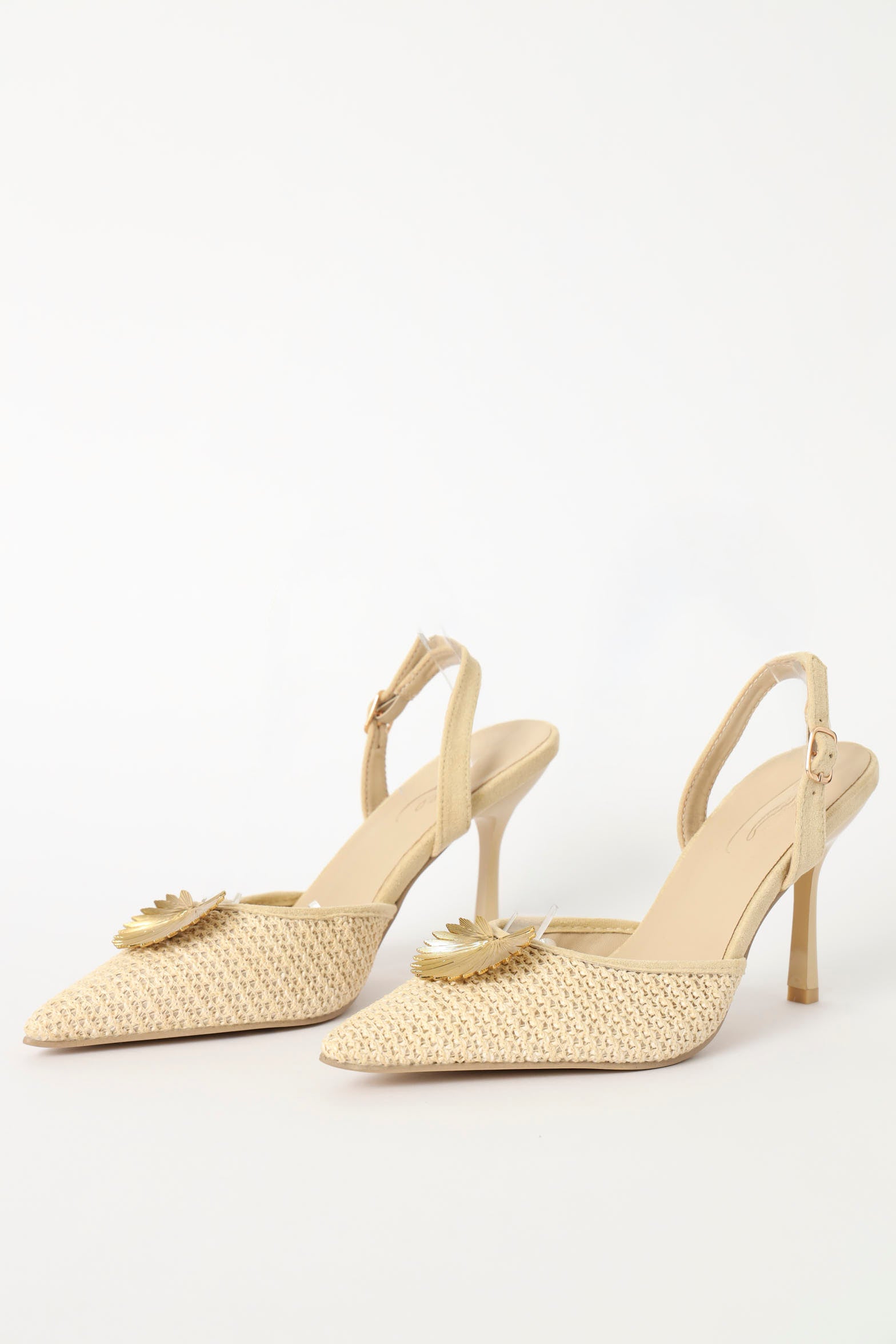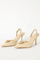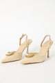 Elevate your everyday style with this striking pointy slingback heel. The natural tone pairs effortlessly with any wardrobe, while the fan trim detail adds a touch of sophistication and visual interest. The slingback design ensures a secure, comfortable fit, making it perfect for work, weekend outings, or special occasions. A versatile essential that transitions seamlessly from day to night.