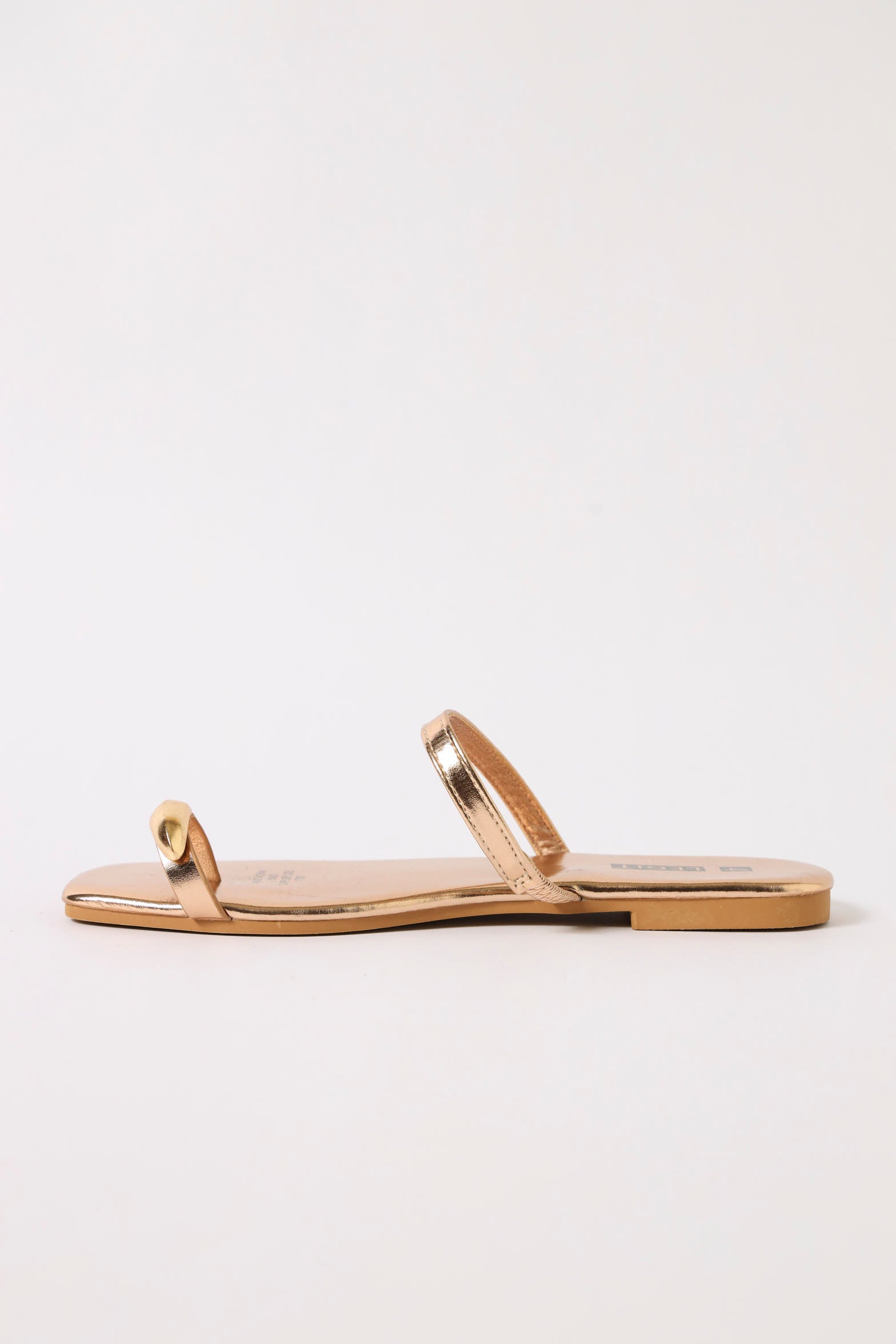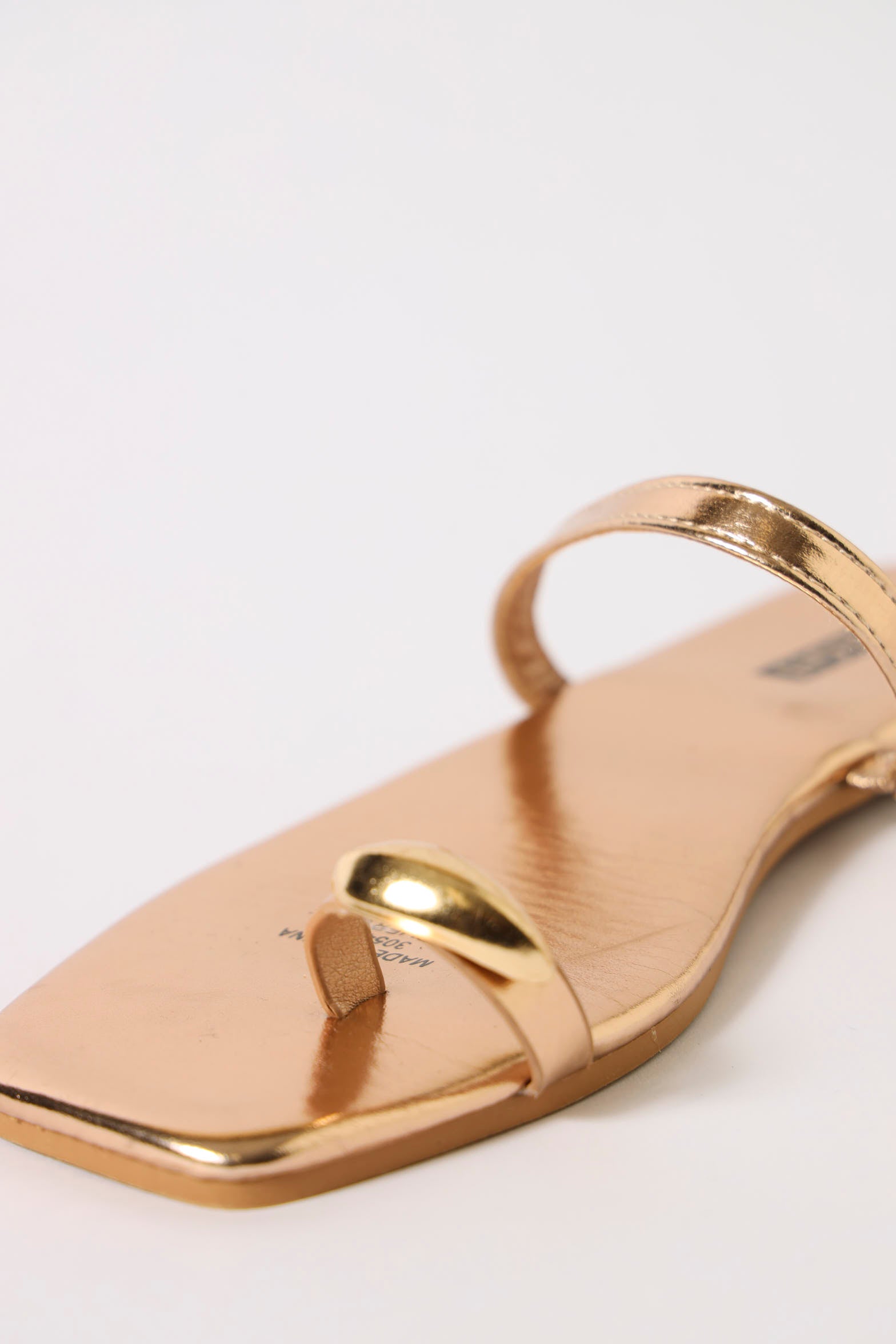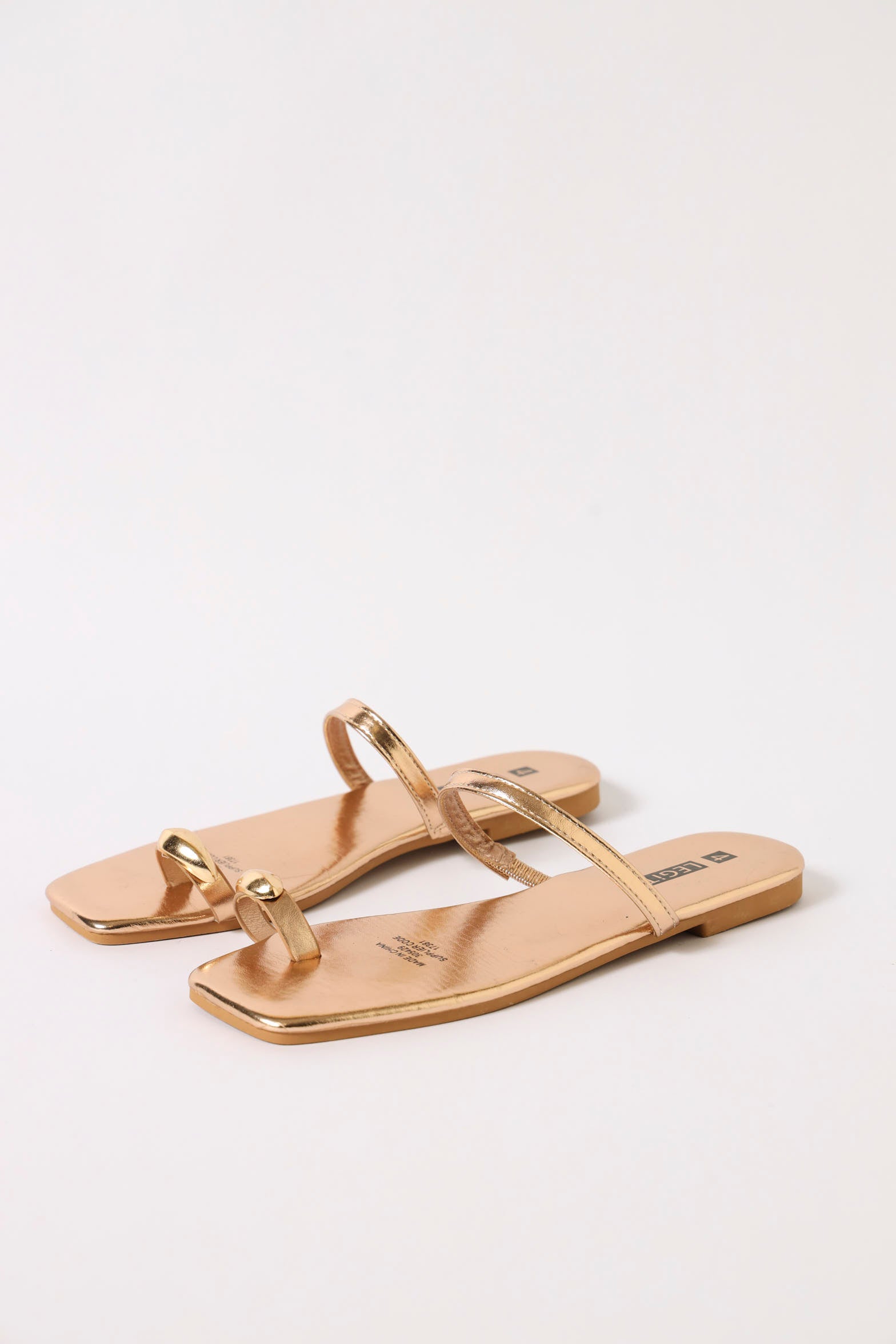 Shine bright like a diamond in these glamorous metallic toe post sandals finished with luxe gold trim. The sleek toe post design keeps your foot secure while the shimmering gold finish elevates any outfit from basic to brilliant. Perfect for adding a touch of sparkle to casual days or dressing up your evening look, these sandals are your golden ticket to instant style. Glam it up!