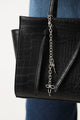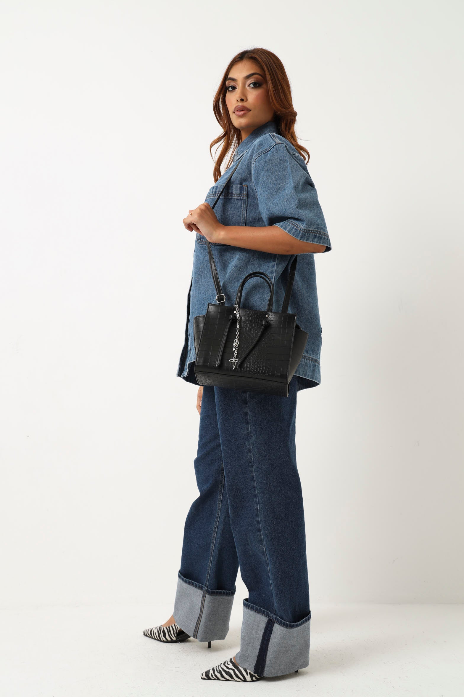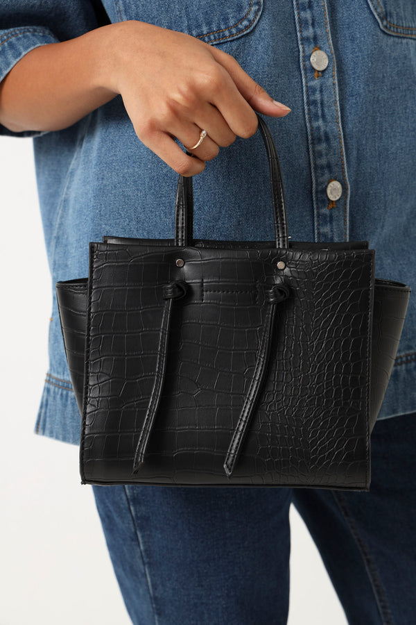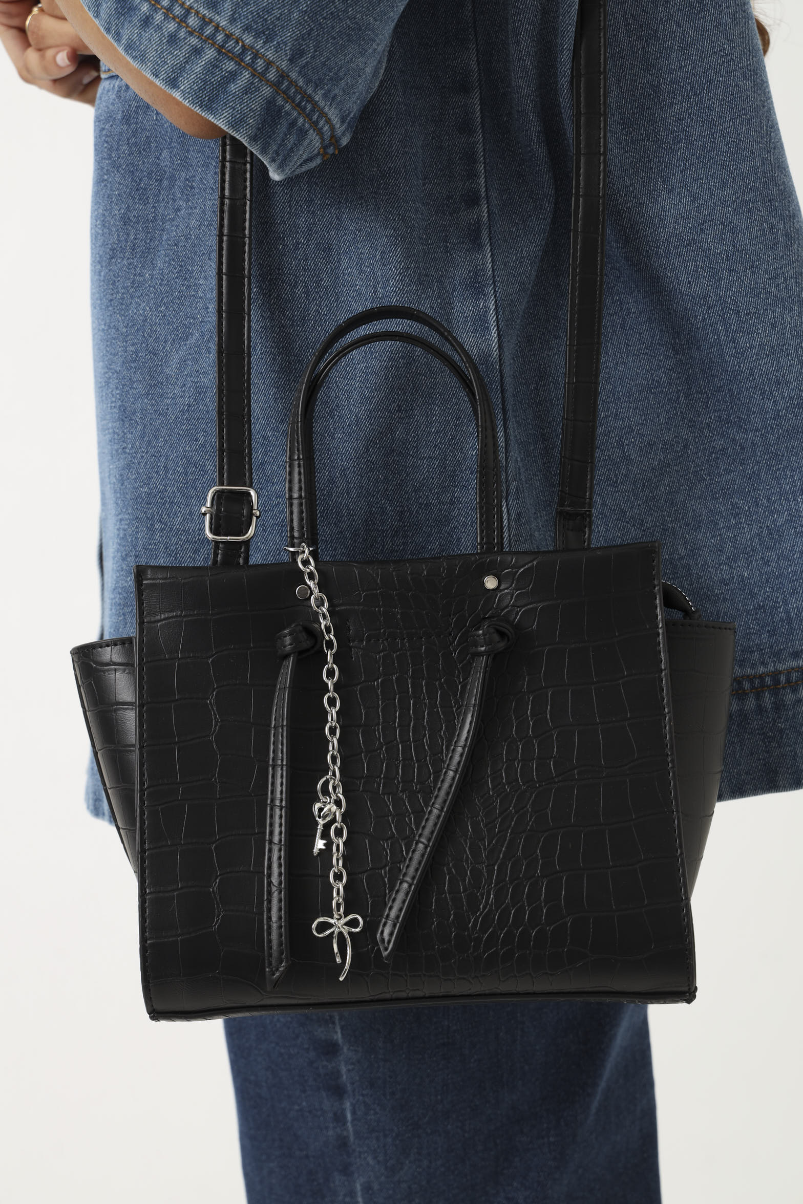 Make a statement with this sophisticated tote bag, designed with an eye-catching double front knot detail and delicate heart charm. The black exterior paired with silver hardware creates a chic, modern look that complements any wardrobe. Spacious enough for work essentials, weekend shopping, or everyday adventures, this bag offers both style and substance. Durable construction and comfortable handles make it your go-to companion for any occasion. An understated yet distinctive accessory that brings personality to your daily routine.