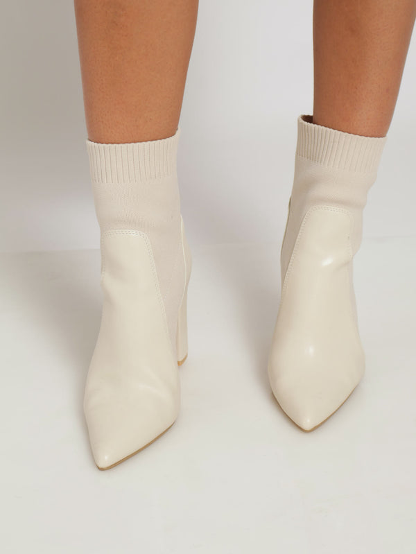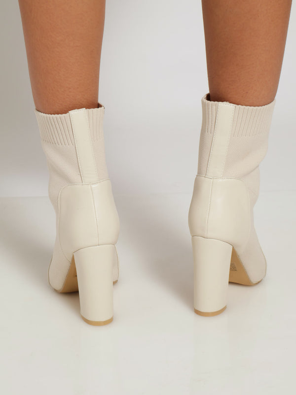 Heeled Ankle Pointed Sock Boot With Rib Detail - Off White