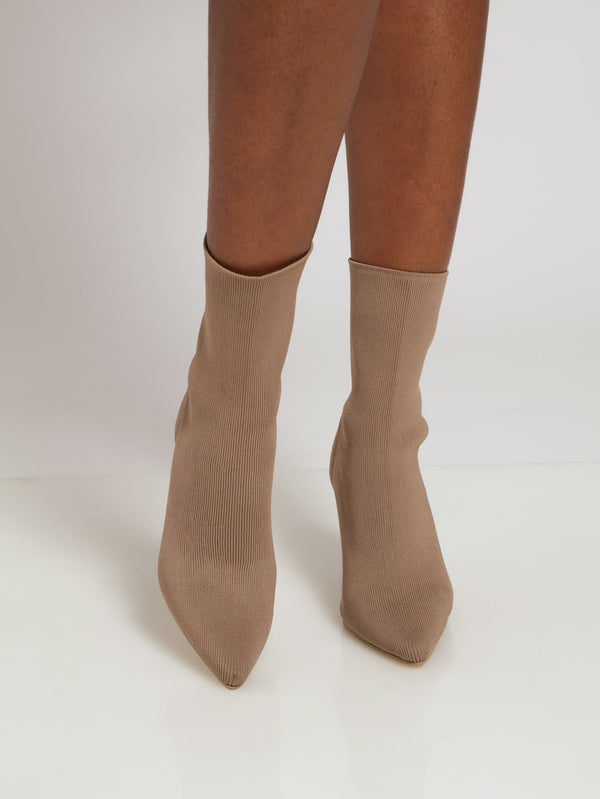 Stride confidently in these quirky heeled sock boots. Featuring a pointy toe and mid calf height, these boots add a touch of sophistication to your style. Make a statement with these taupe beauties!