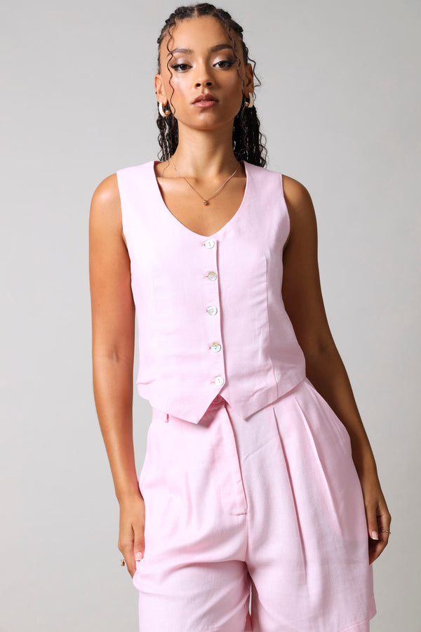 Layer up your style game with this gorgeous linen waistcoat in blush pink! Light, breathable, and endlessly versatile, this piece transforms any outfit from basic to brilliant. Throw it over a crisp white shirt for polished elegance, pair it with a casual tee for weekend vibes, or dress it up for those moments when you need to look sharp. The perfect addition to your wardrobe for adding dimension, texture, and that "I've got my life together" energy!