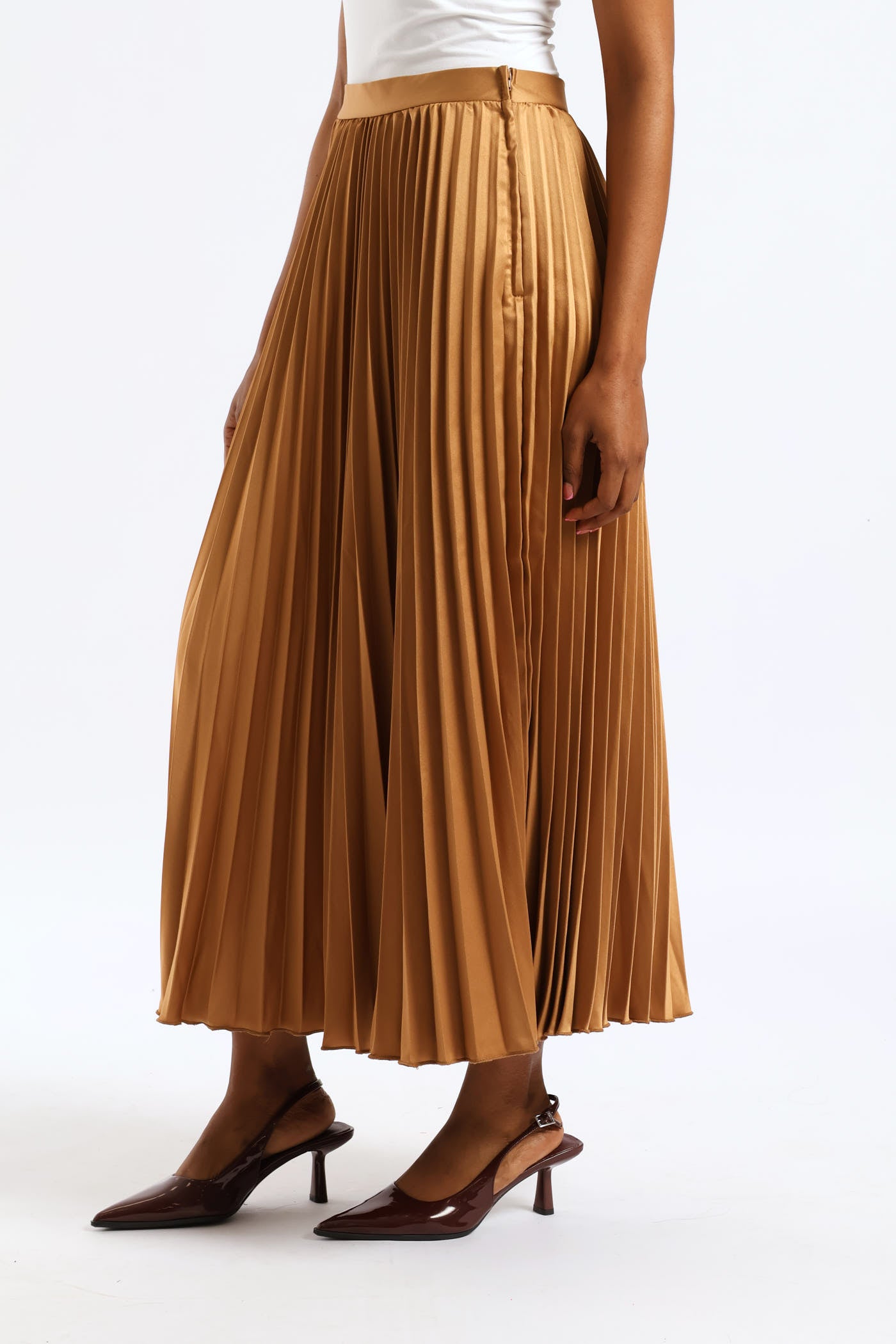 Elevate your wardrobe with this long length pleated skirt in a warm tan shade. Its flowing pleats create a graceful, whimsical movement with every step, perfect for twirling through the day. Lightweight and versatile, it pairs effortlessly with your favorite tops for both casual outings and dressier occasions. Add a splash of playful elegance to your style with this timeless skirt!