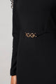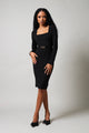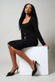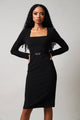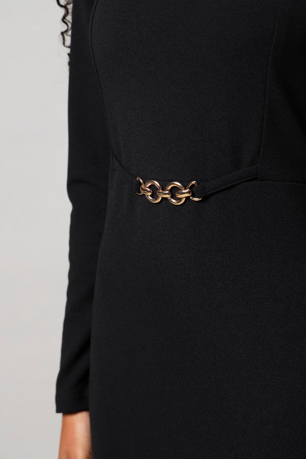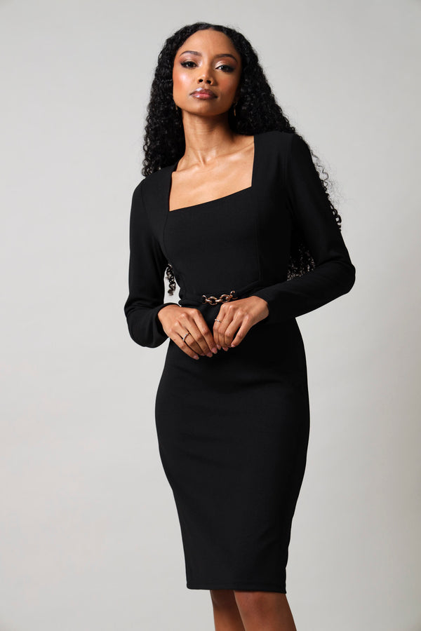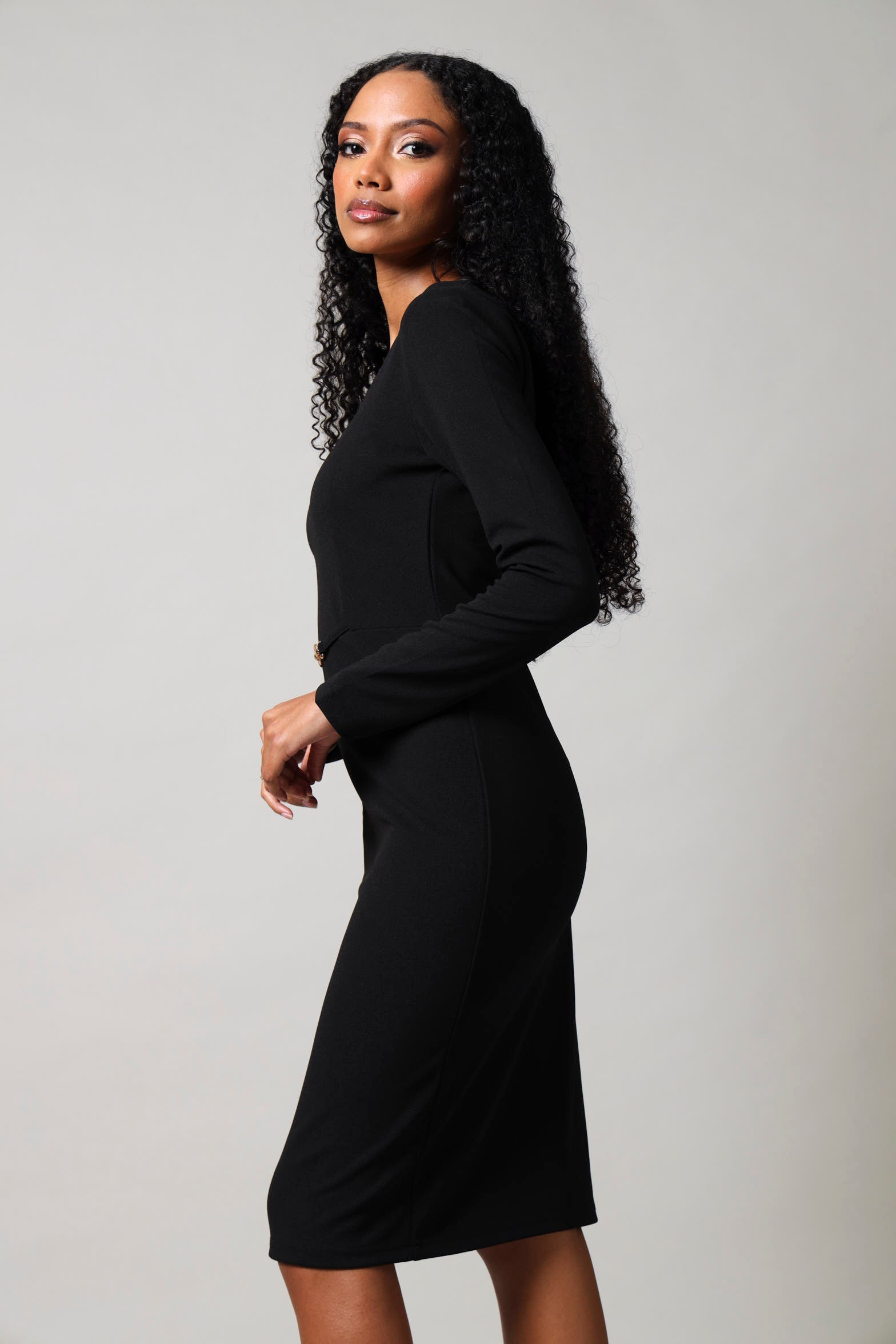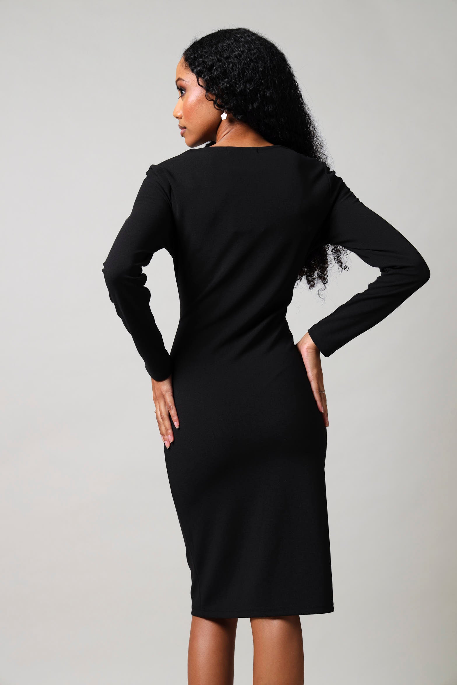 Sleek and sophisticated, this long sleeve bodycon dress in classic black offers a flattering silhouette that hugs your curves in all the right places. The trim detailing adds a modern edge, making it perfect for nights out, date nights, or elevated casual occasions. The long sleeves provide coverage while maintaining that body-conscious fit that turns heads. Versatile enough to dress up with heels and jewellery or down with sneakers for an effortless look. A wardrobe essential that works season after season.
