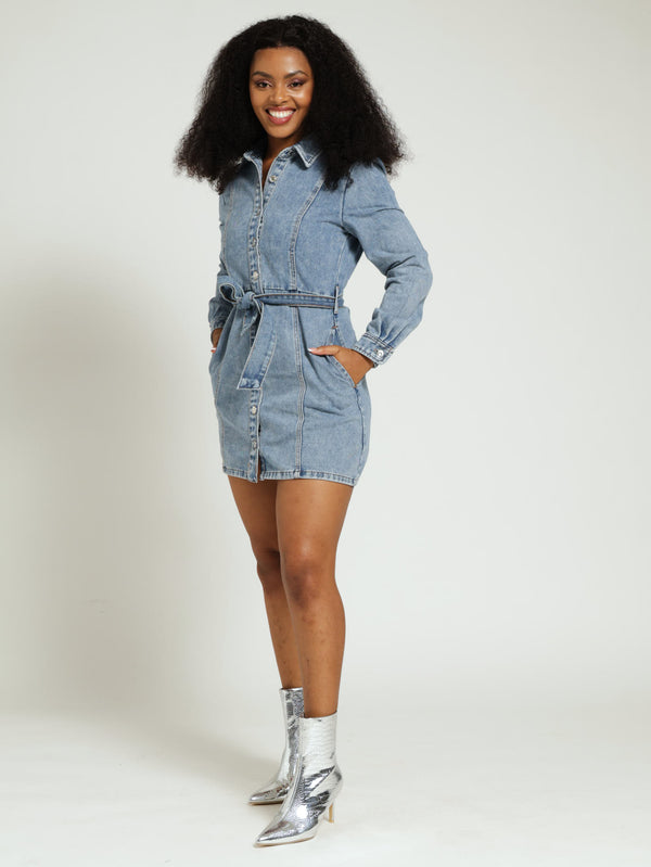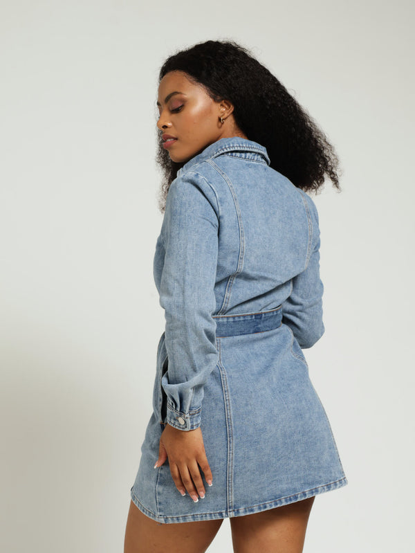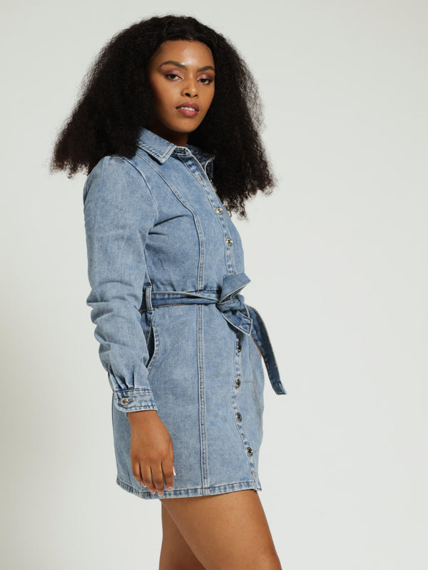 Long Sleeve Denim Shirt Dress - Salty Mid Wash