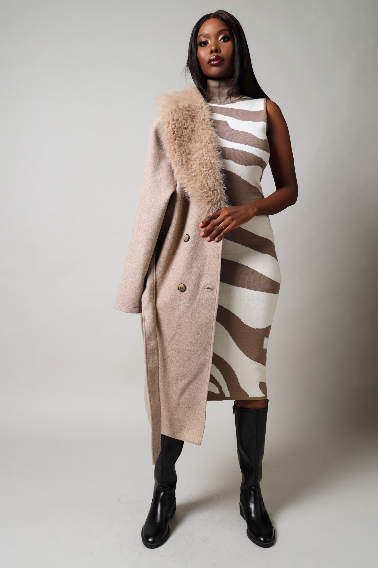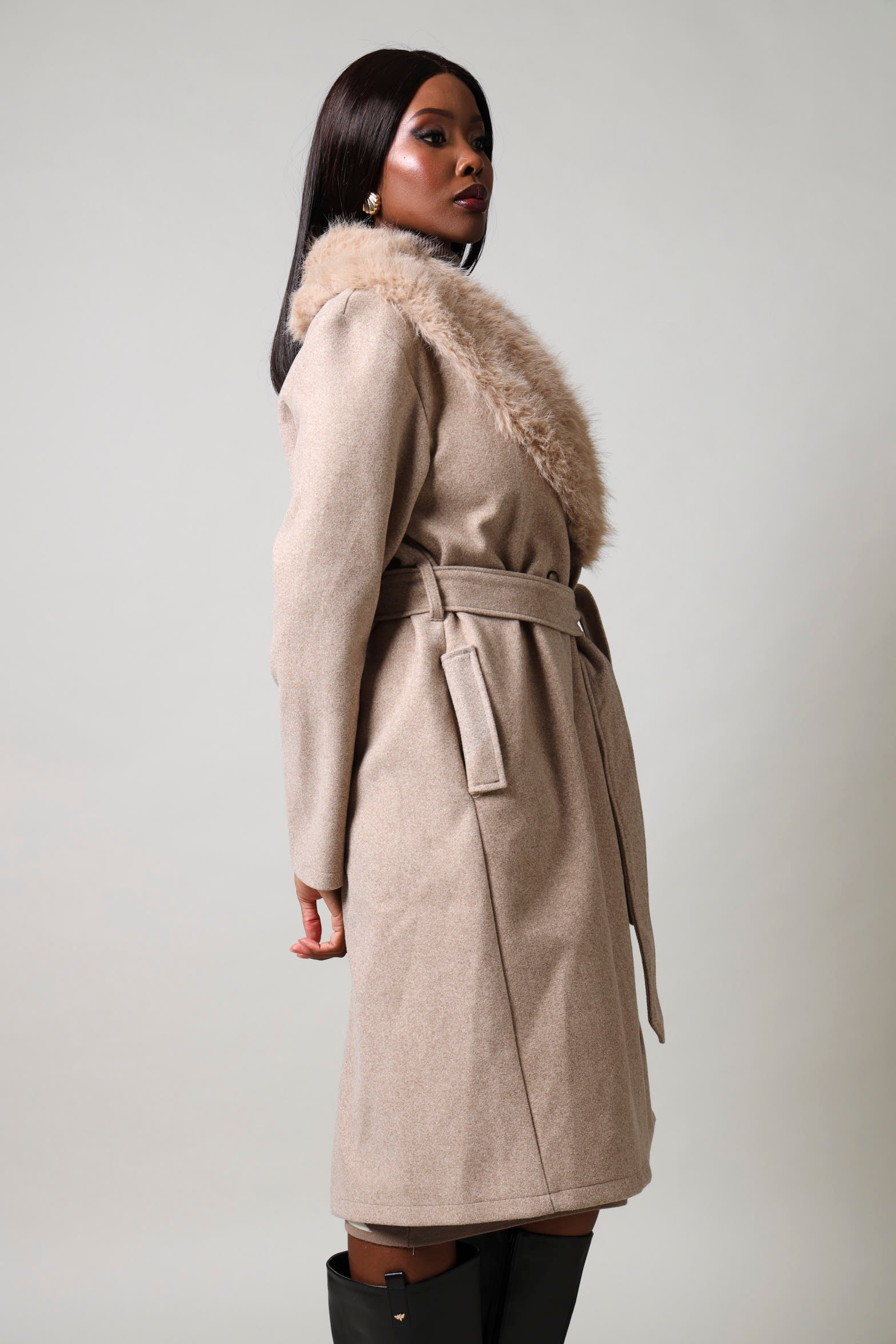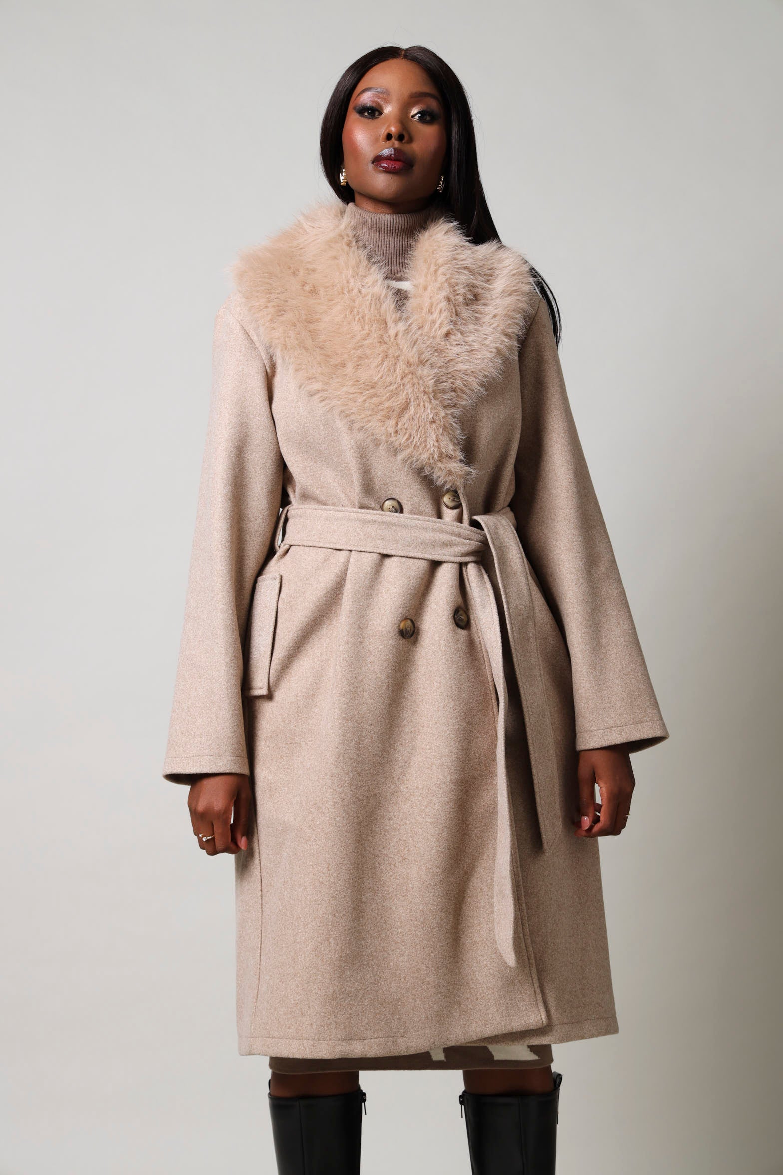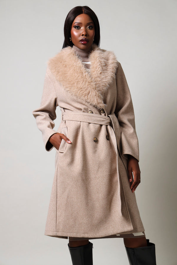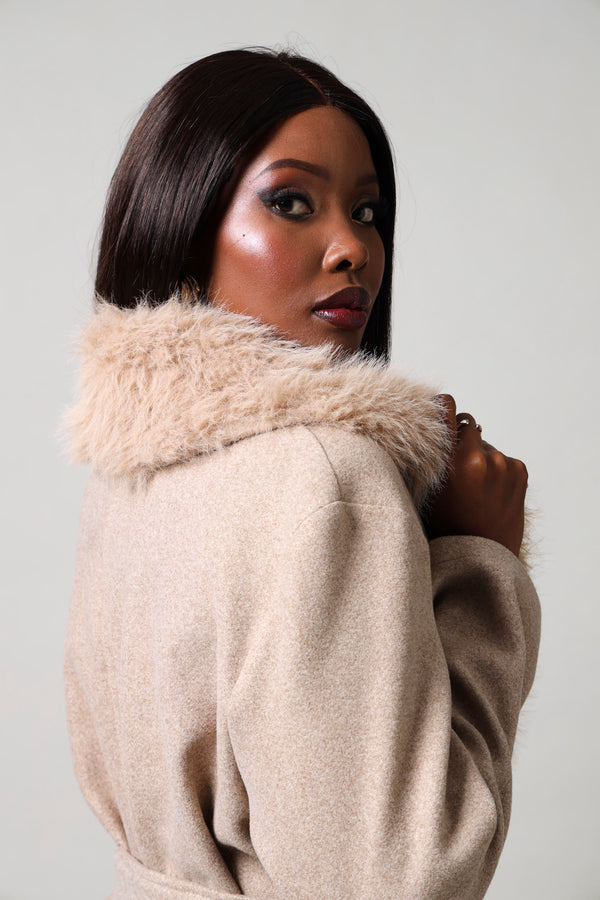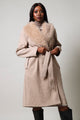 Long Sleeve Fur Melton Coat - Brown
