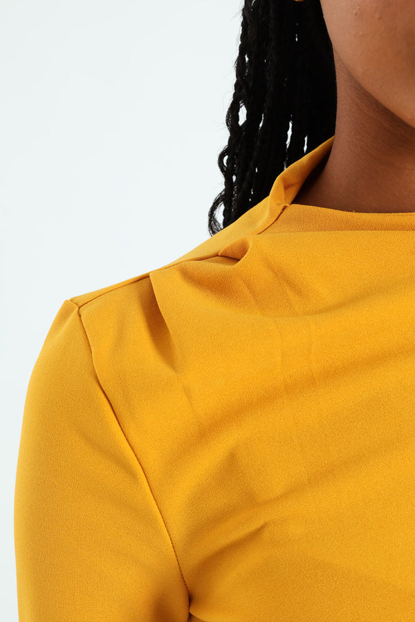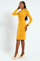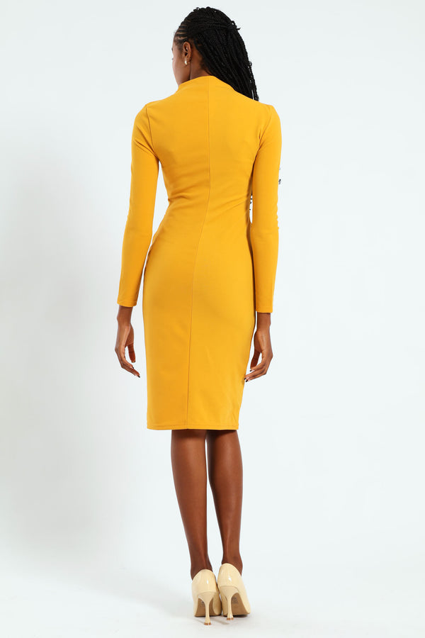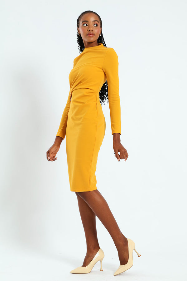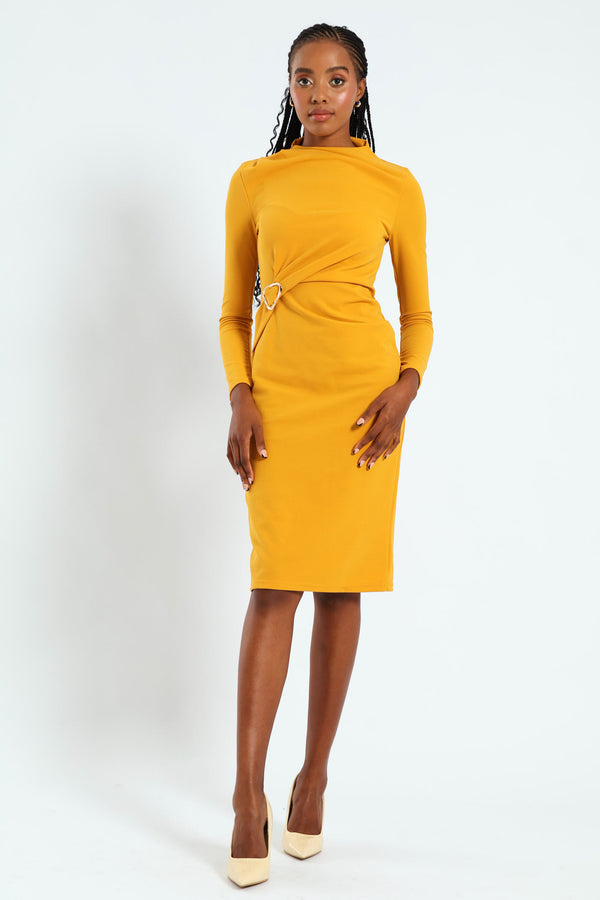 Long Sleeve Gauged Buckle Detail Dress - Mustard
