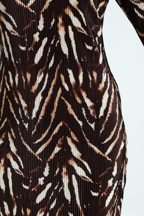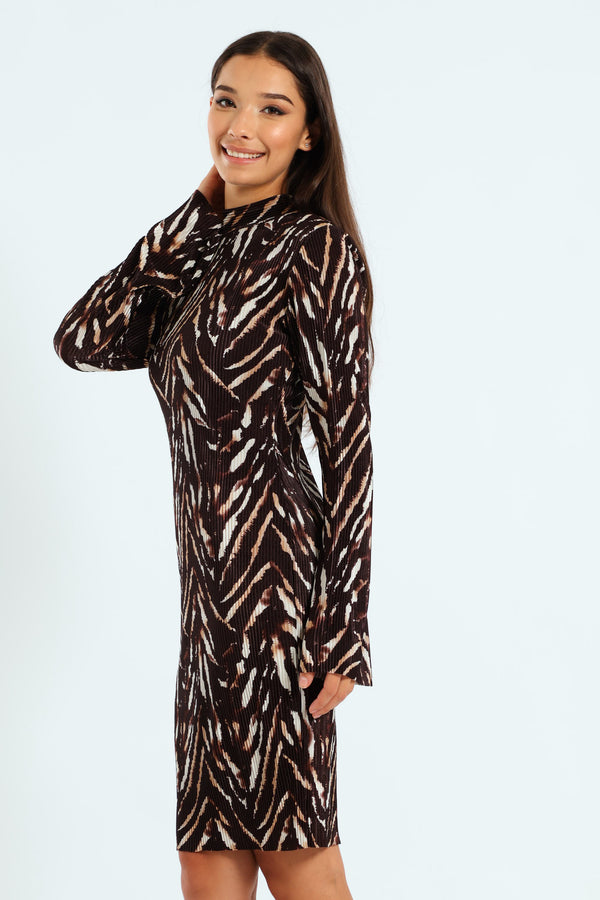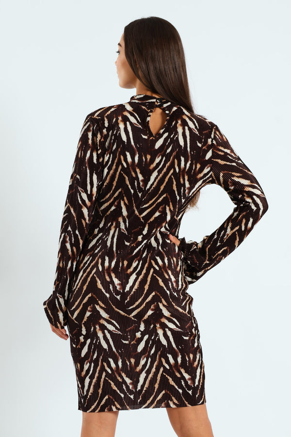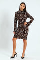 Long Sleeve Hi Neck Flare Sleeve Bodre Mini Dress - Animal