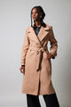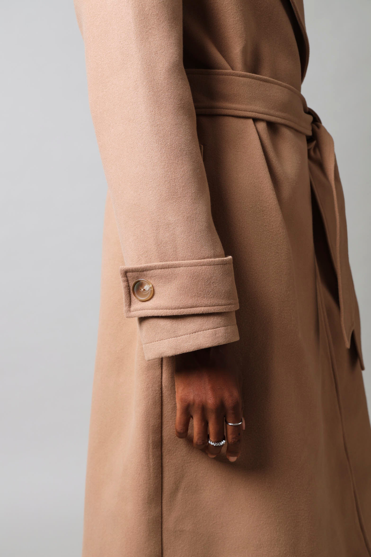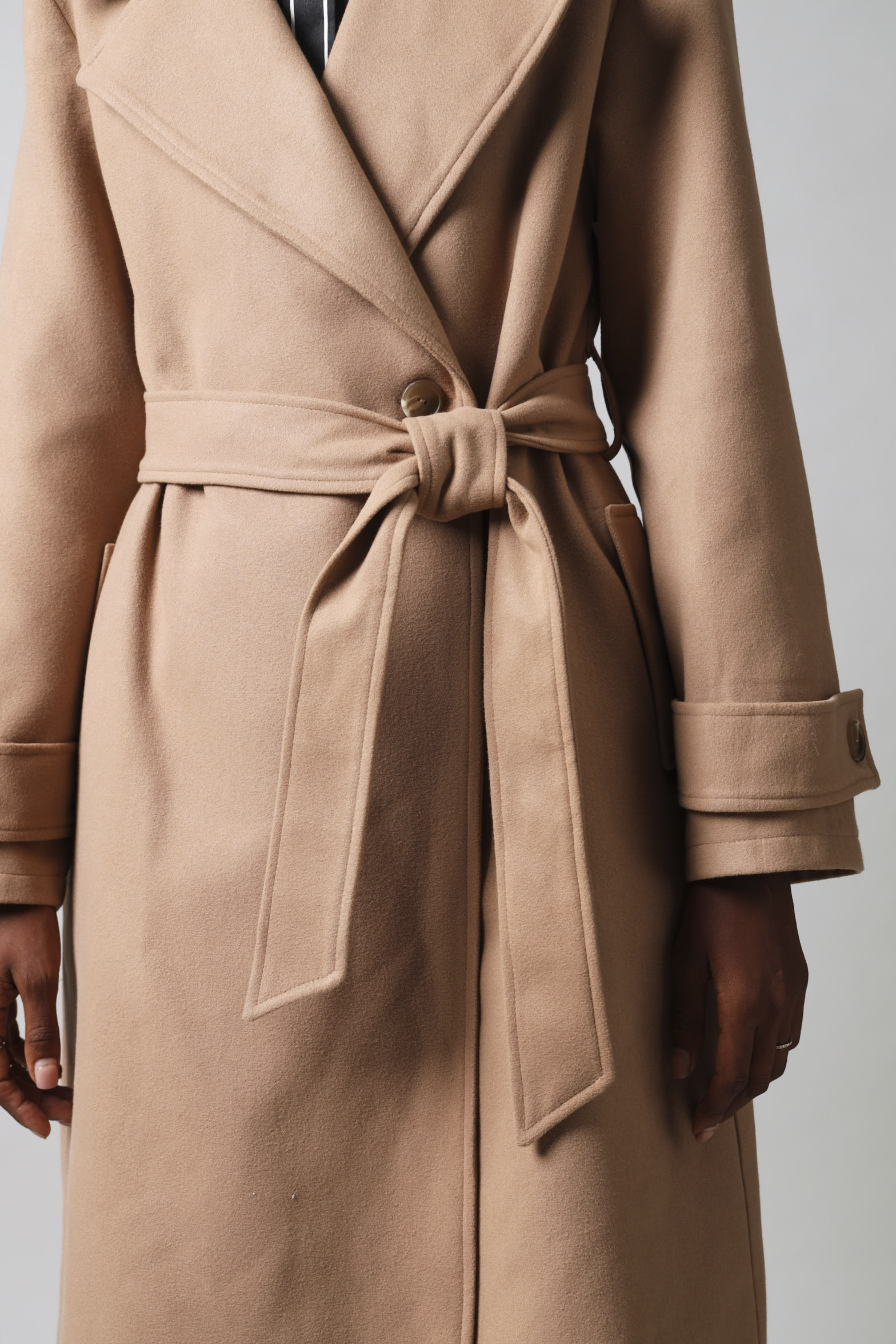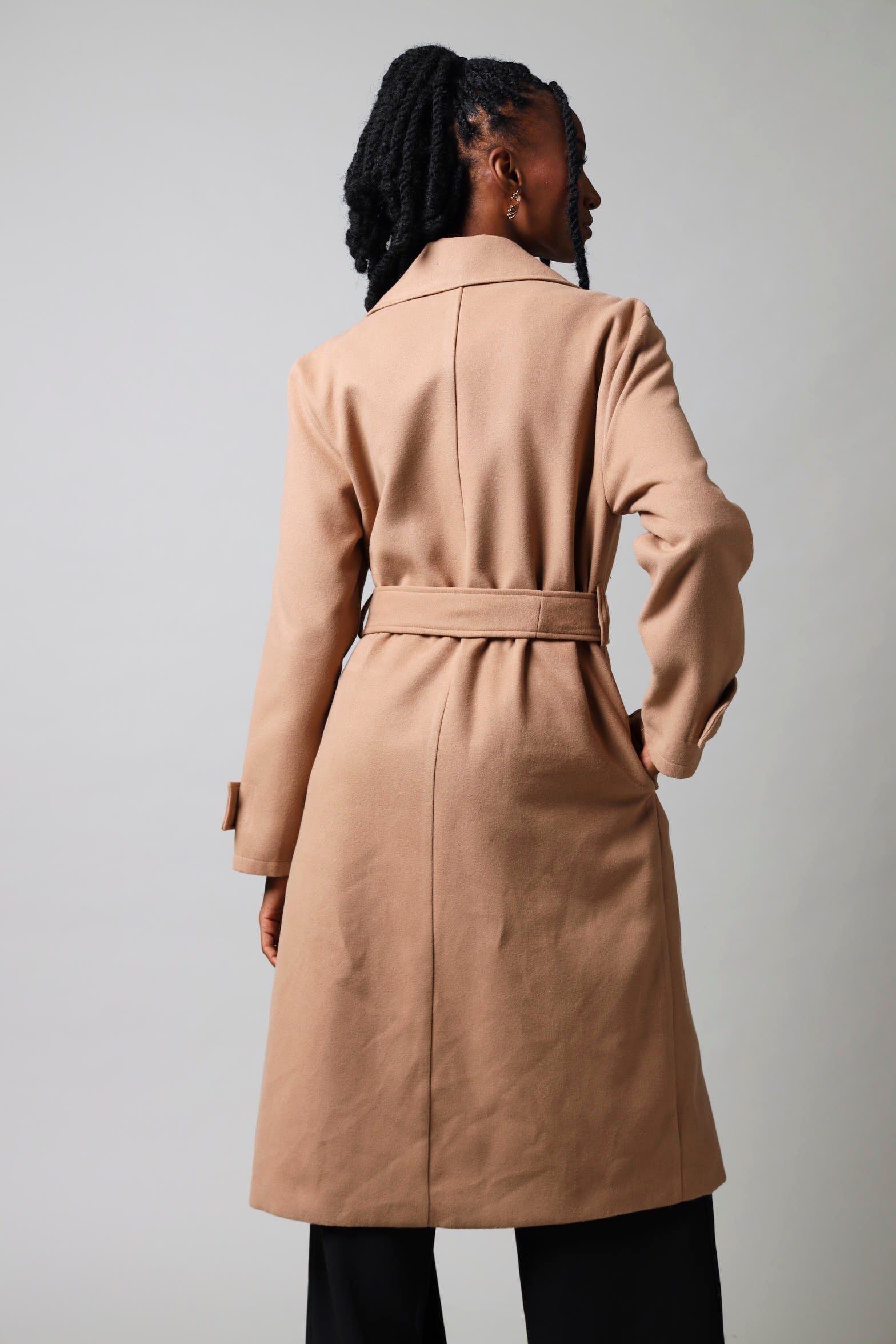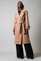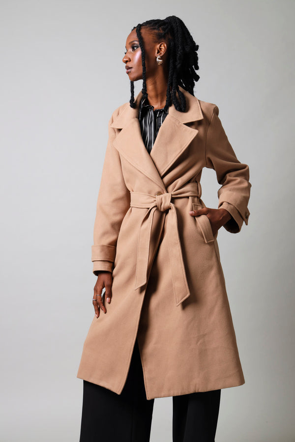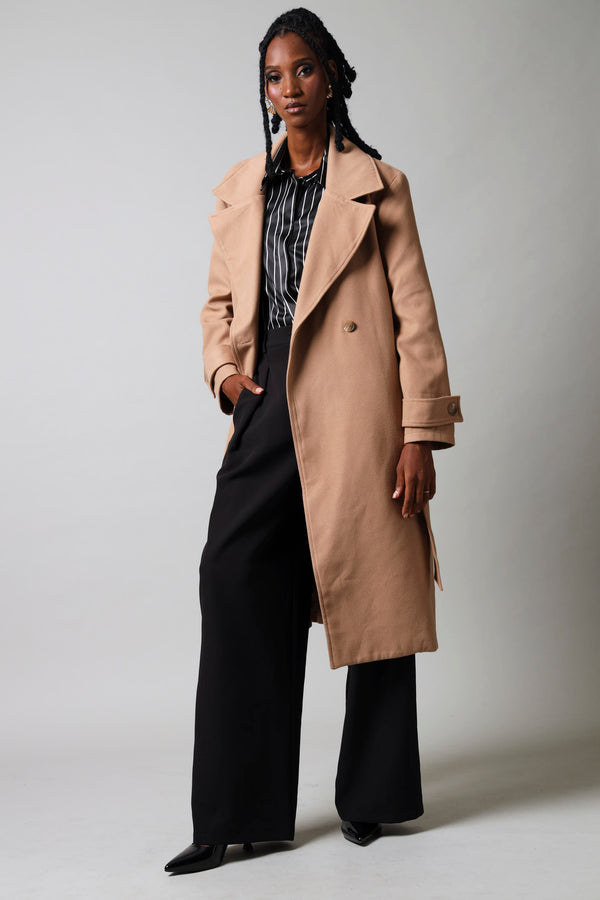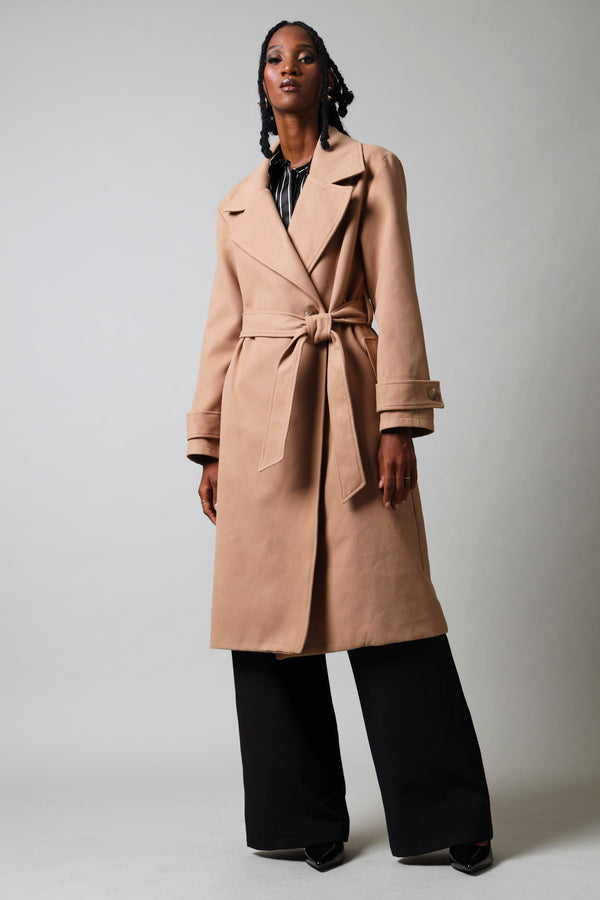 This Long Sleeve Melton Trench Coat in tan exemplifies understated luxury and refined tailoring. Constructed from substantial melton wool fabric, it offers superior warmth and durability with a distinctly polished aesthetic. The classic trench silhouette features clean lines and structured proportions that command attention without ostentation. Versatile enough to complement both formal and smart-casual wardrobes, this investment piece transcends seasonal trends. Layer it over tailored separates or casual basics for an effortlessly sophisticated appearance that speaks to discerning taste and timeless style sensibility.