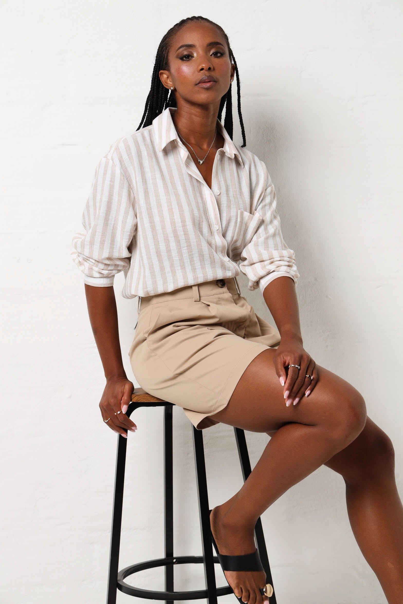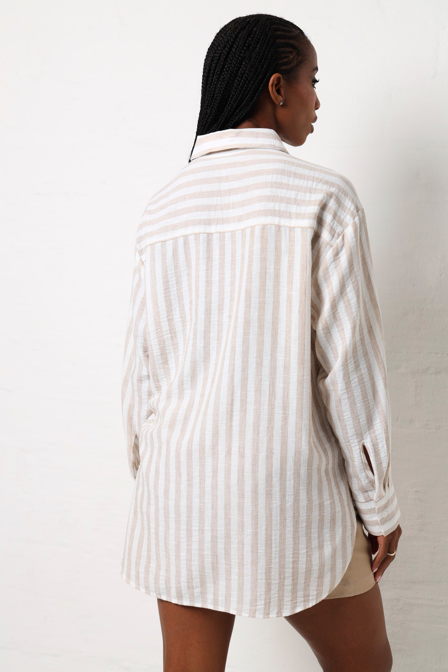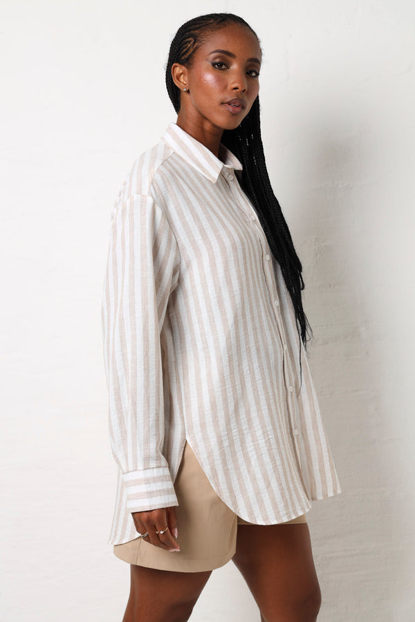 Stripes never go out of style and this long sleeve shirt proves it. Crafted in a timeless stone and white combination, it's the kind of piece that works whether you're dressing up for the office or keeping things casual on the weekend. The classic striped pattern adds visual interest without demanding attention, while the long sleeves offer versatility across seasons. Throw it on with jeans, chinos, or a skirt and watch it become your go-to favourite. Simple, sharp, and endlessly wearable.