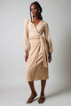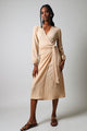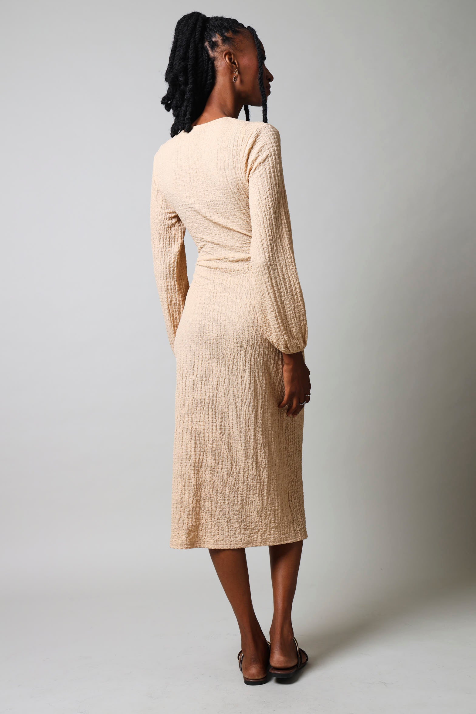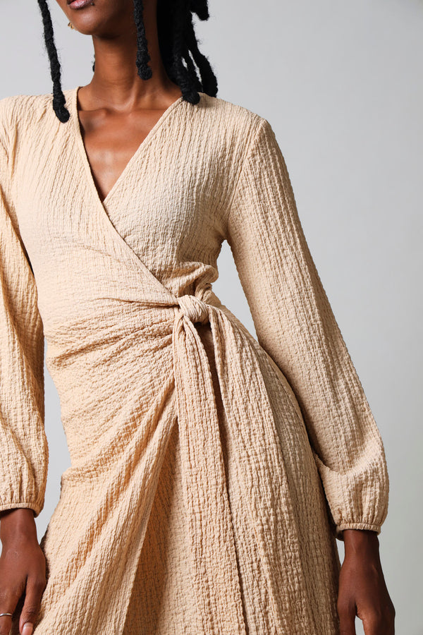 This long sleeve wrap dress in nude exemplifies understated sophistication. The textured weave adds dimension and tactile appeal, while the wrap construction offers a customizable fit that complements diverse silhouettes. Designed for the discerning individual, it seamlessly bridges professional and social settings with quiet confidence. A wardrobe cornerstone that celebrates refined simplicity and enduring style.