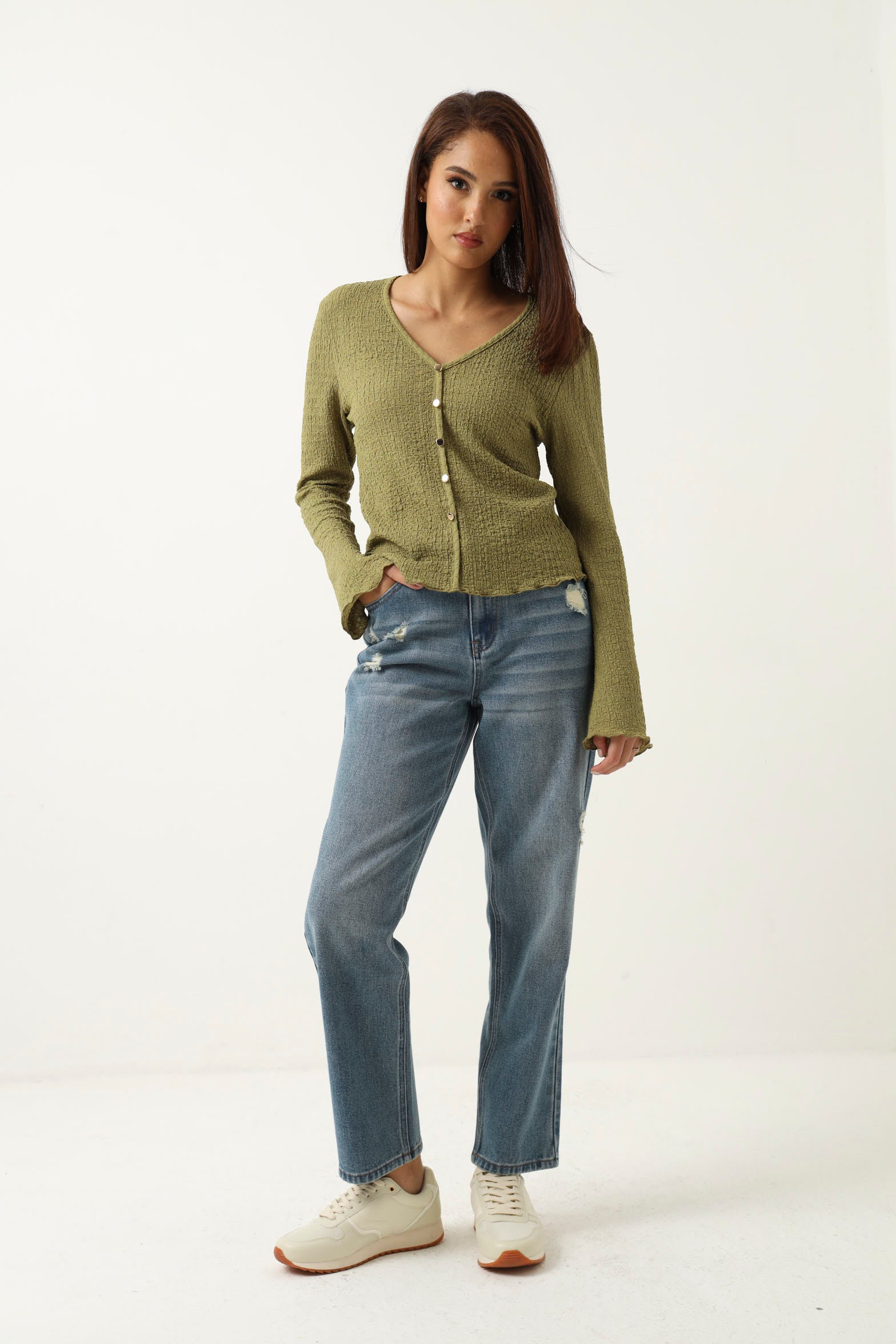 Effortless elegance meets everyday comfort in this long sleeve V neck crinkle knit top. The textured crinkle fabric adds visual interest and dimension, while the flattering V neckline creates a refined silhouette. Crafted in a vibrant chartreuse hue, this versatile piece transitions seamlessly from casual weekends to polished workdays. The relaxed fit and soft knit construction ensure all-day wearability, making it a wardrobe essential for layering or wearing solo.