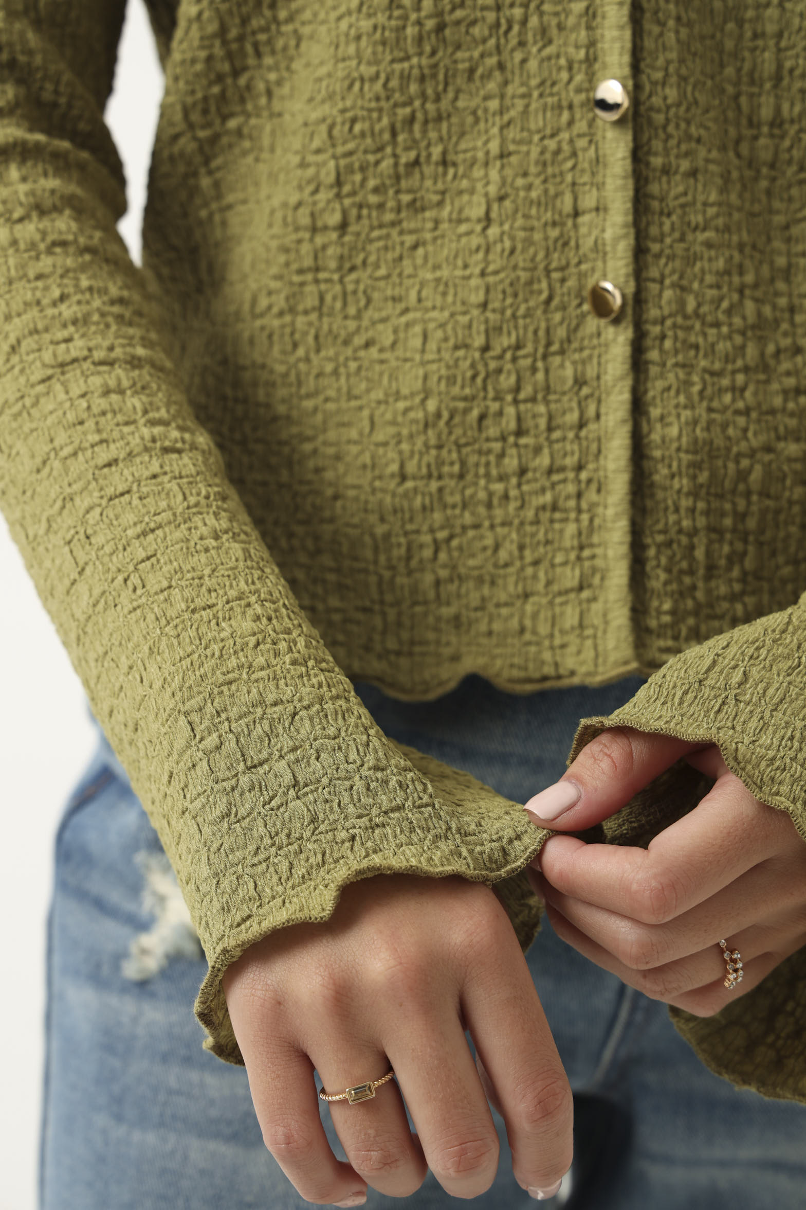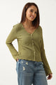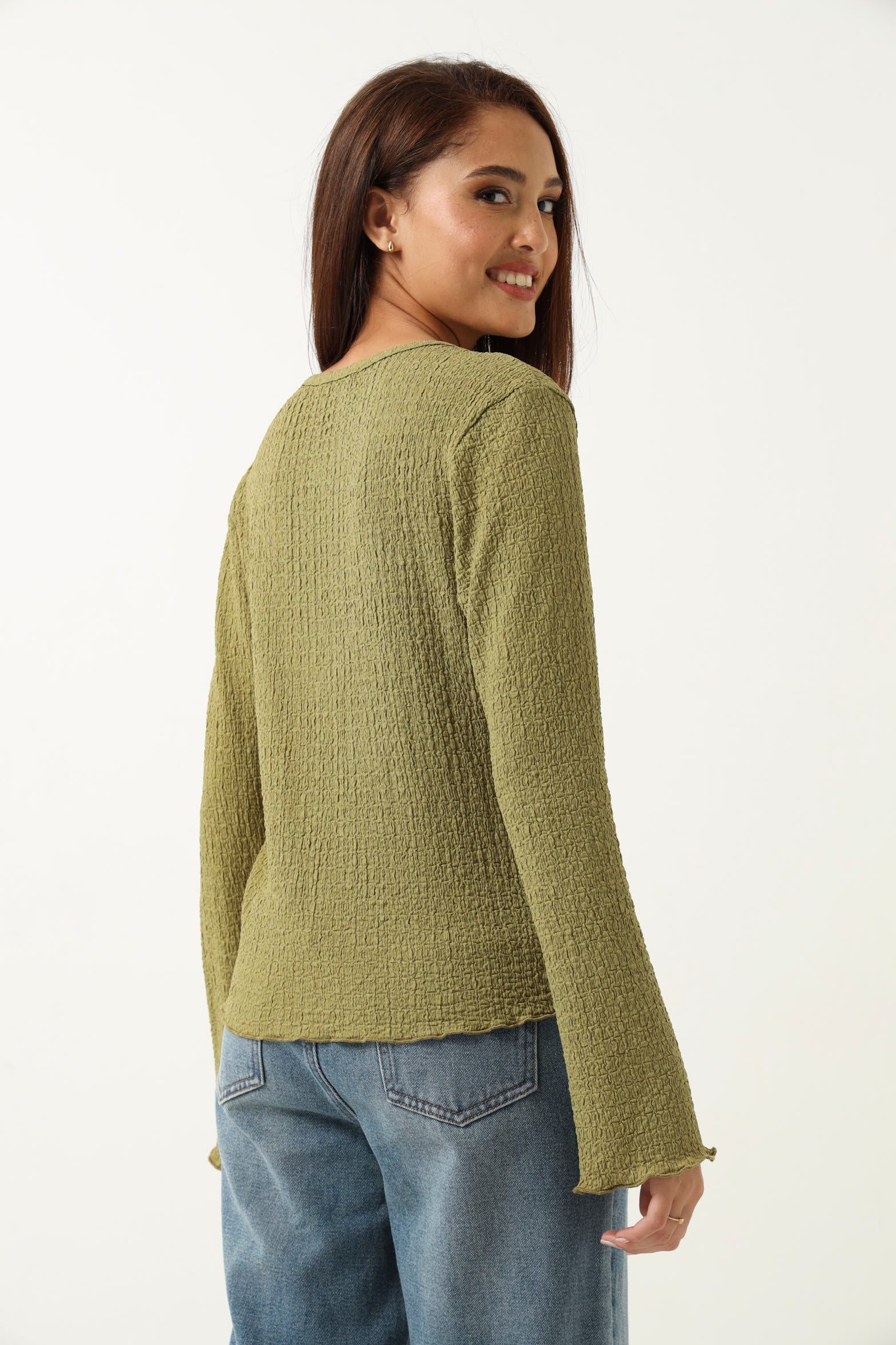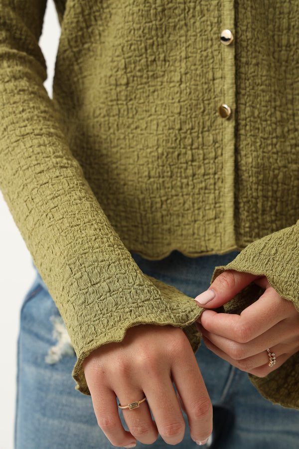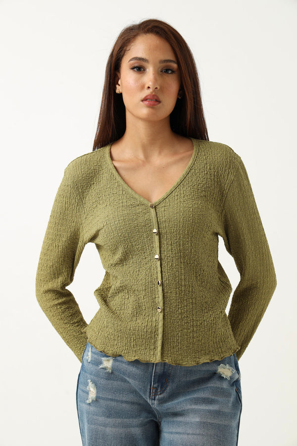Long Sleeve V Neck Crinkle Knit Top - Chartreuse