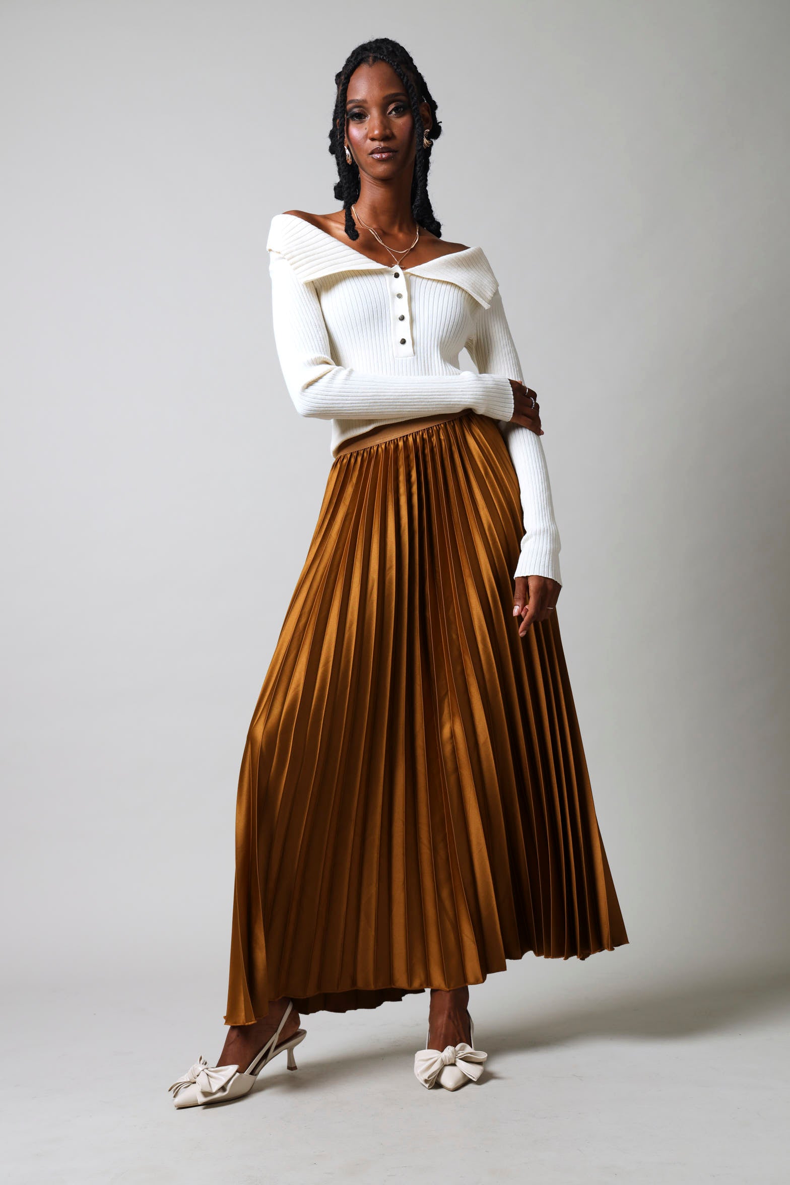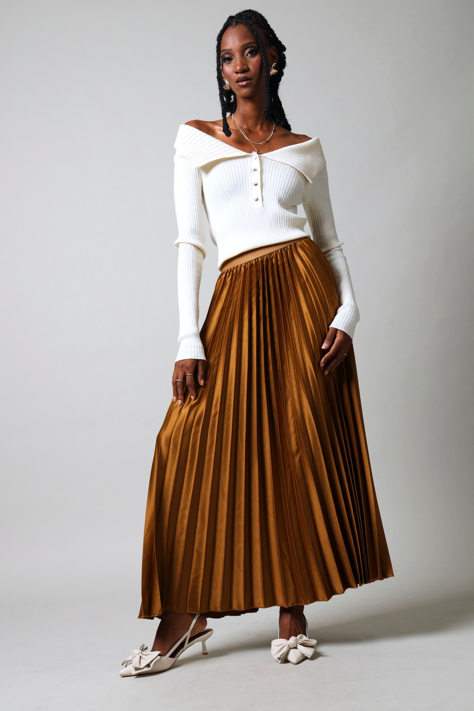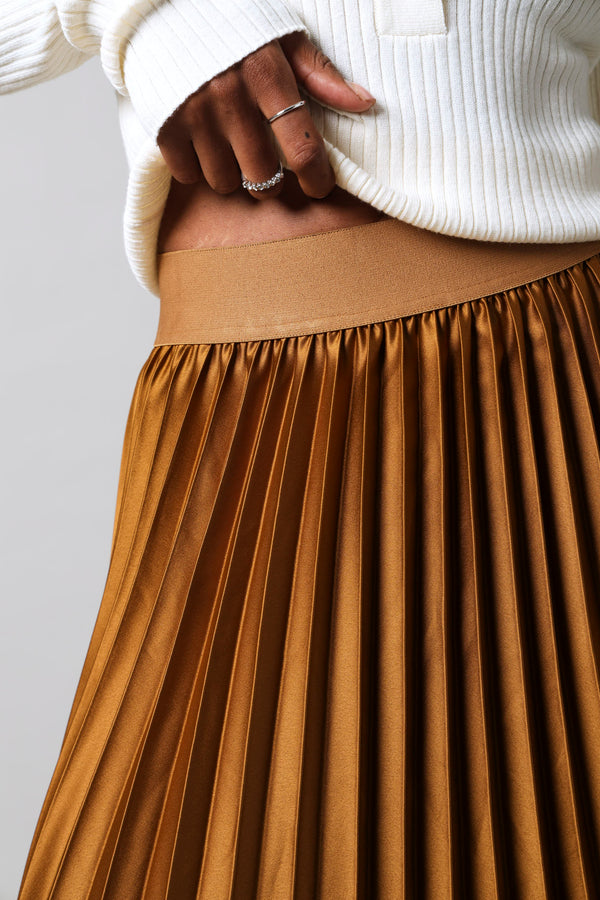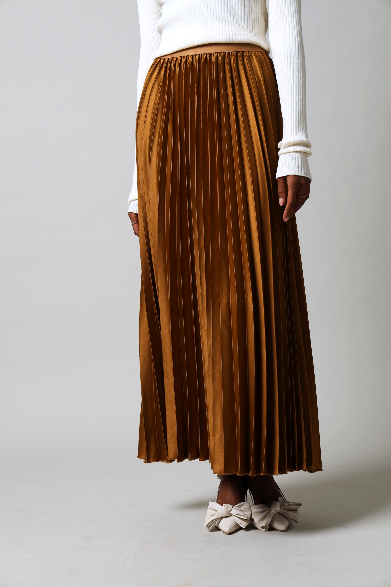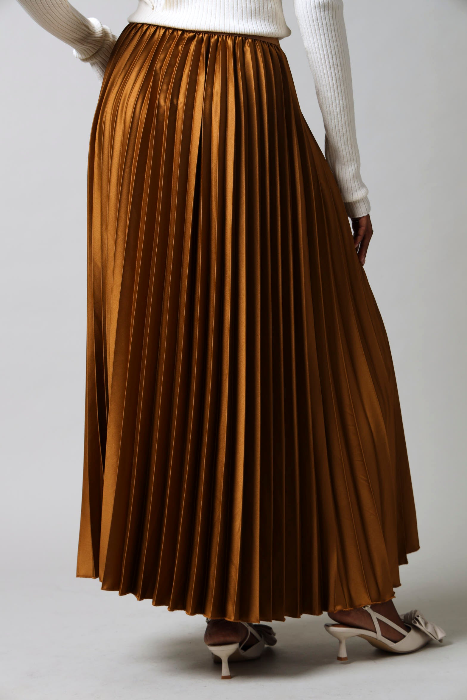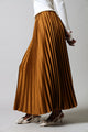 This gold maxi skirt combines architectural pleating with modern comfort, delivering a polished silhouette that transcends occasion. The elasticated waistband sits smoothly against the body, offering flexibility without sacrificing structure or elegance. Crafted for those who appreciate quality and refinement, the flowing length and carefully constructed pleats create visual interest while maintaining a streamlined aesthetic. Whether styled for formal gatherings or refined everyday wear, this piece embodies quiet luxury and pairs effortlessly with both minimalist and statement-making tops.