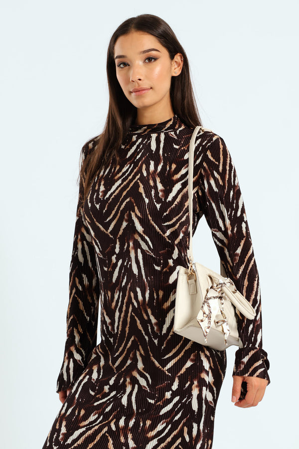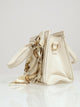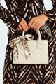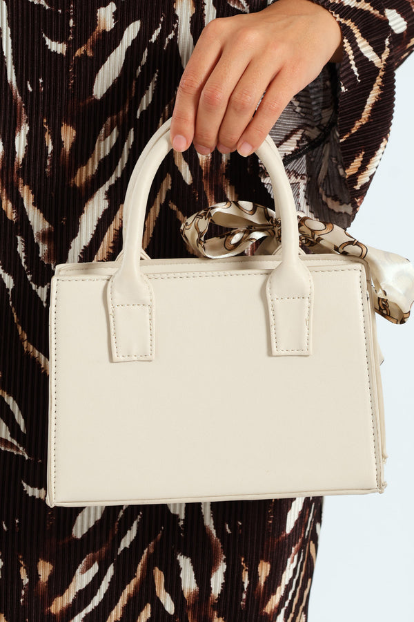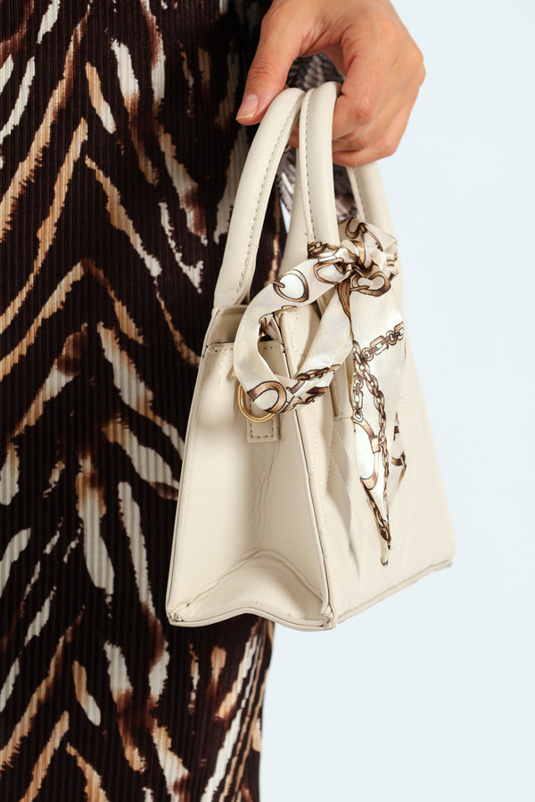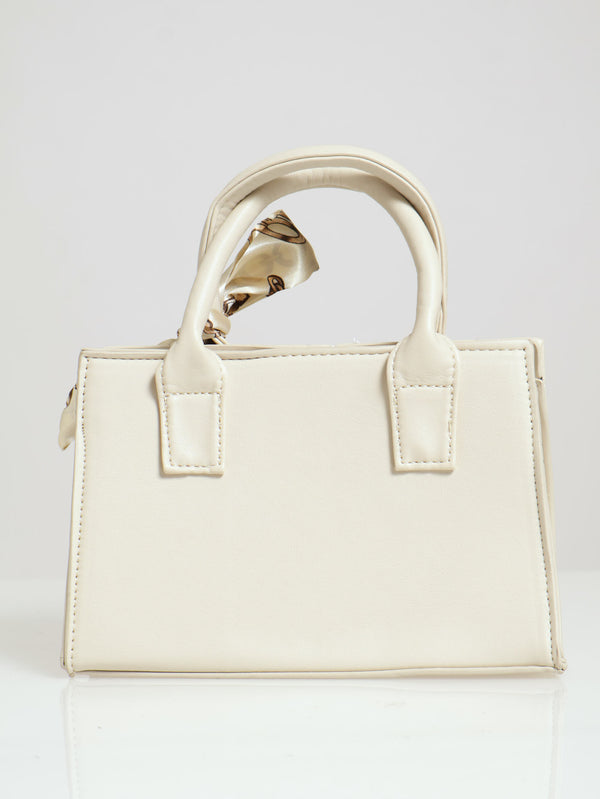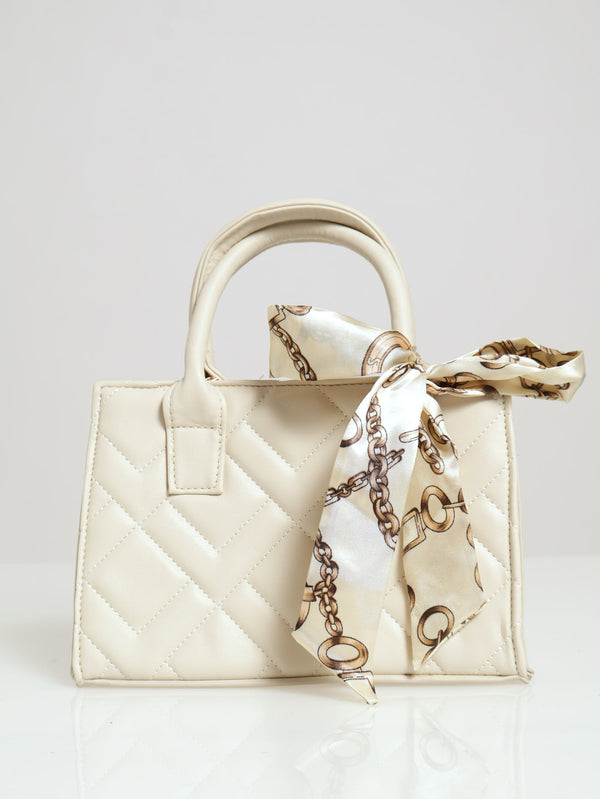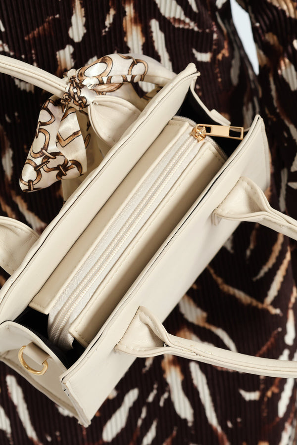 Carry your essentials in style with our Metal Handle Scarf Tote Bag in Cream. The scarf decoration on the handle adds a unique touch, while the detachable and adjustable strap provides convenience. Perfect for a day out, this quirky bag is a must-have!