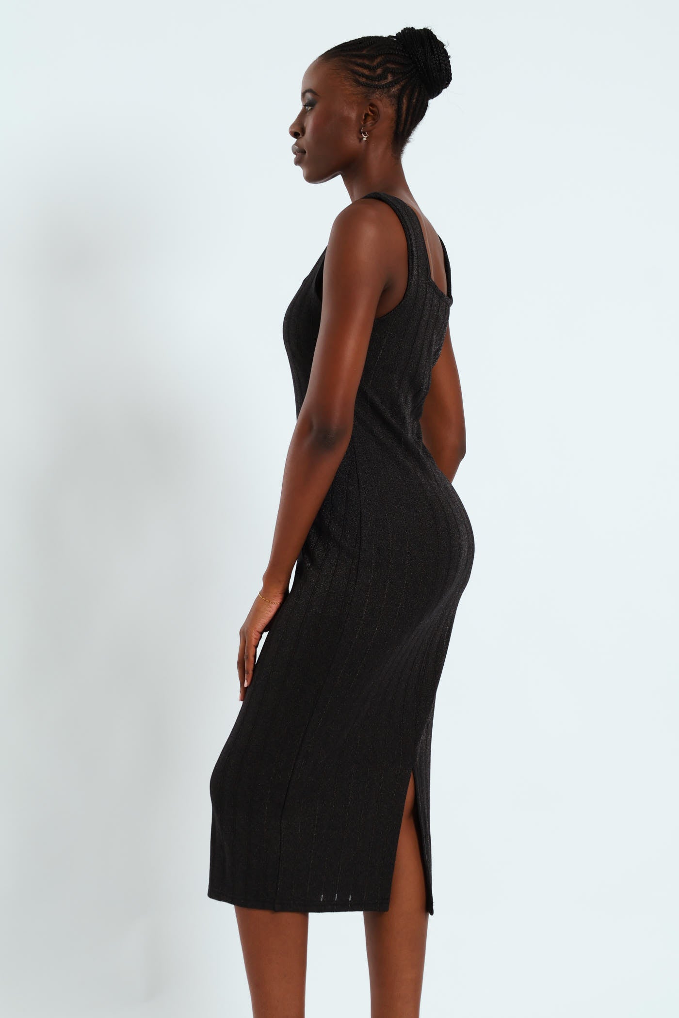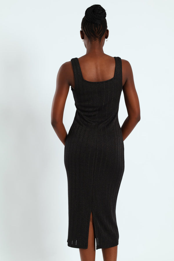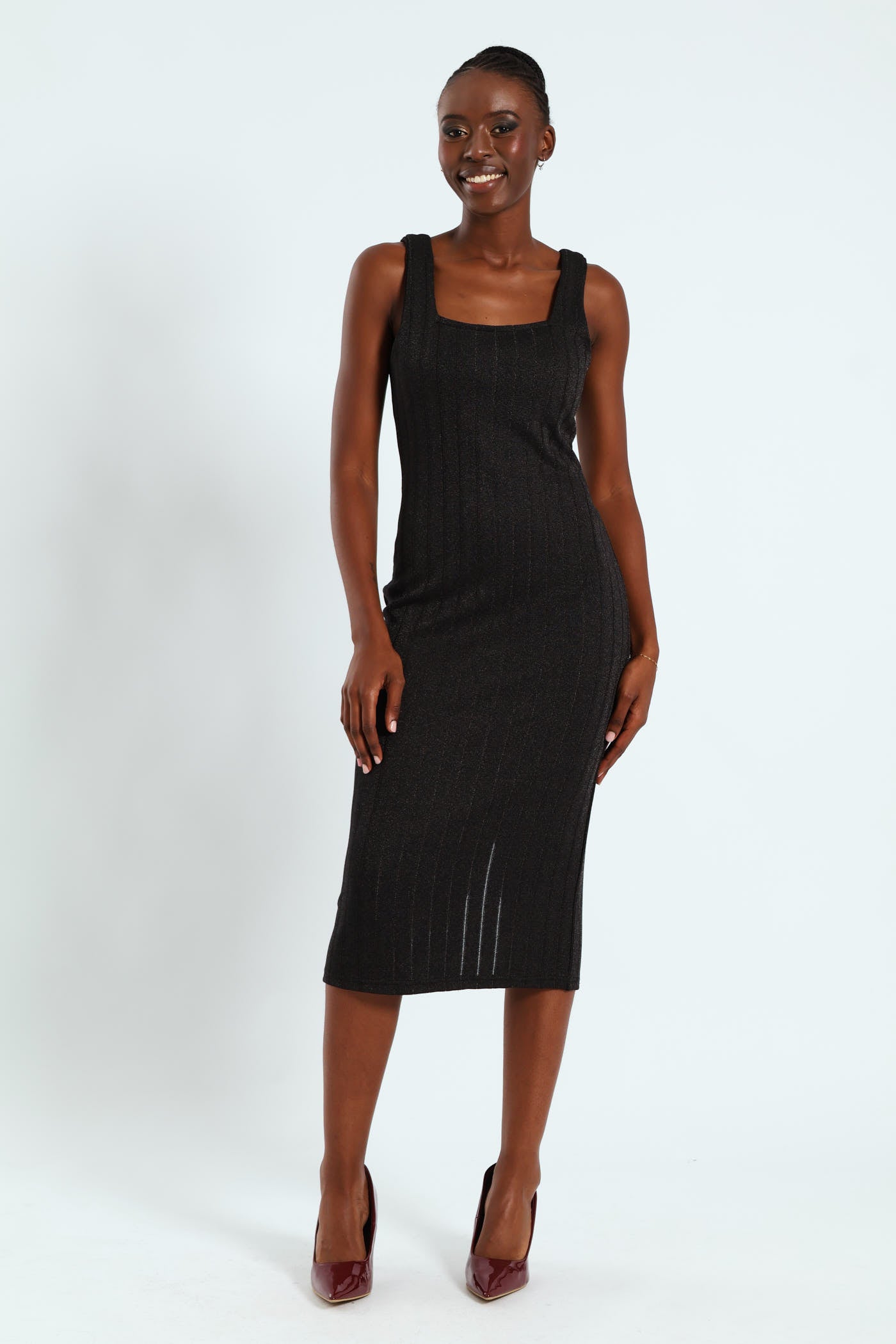 This fun, flirty dress adds some sparkle to any evening out with its shimmering metallic knit design. Perfect for a night on the town, this black dress will have you looking stylish and chic while also being comfortable to wear.