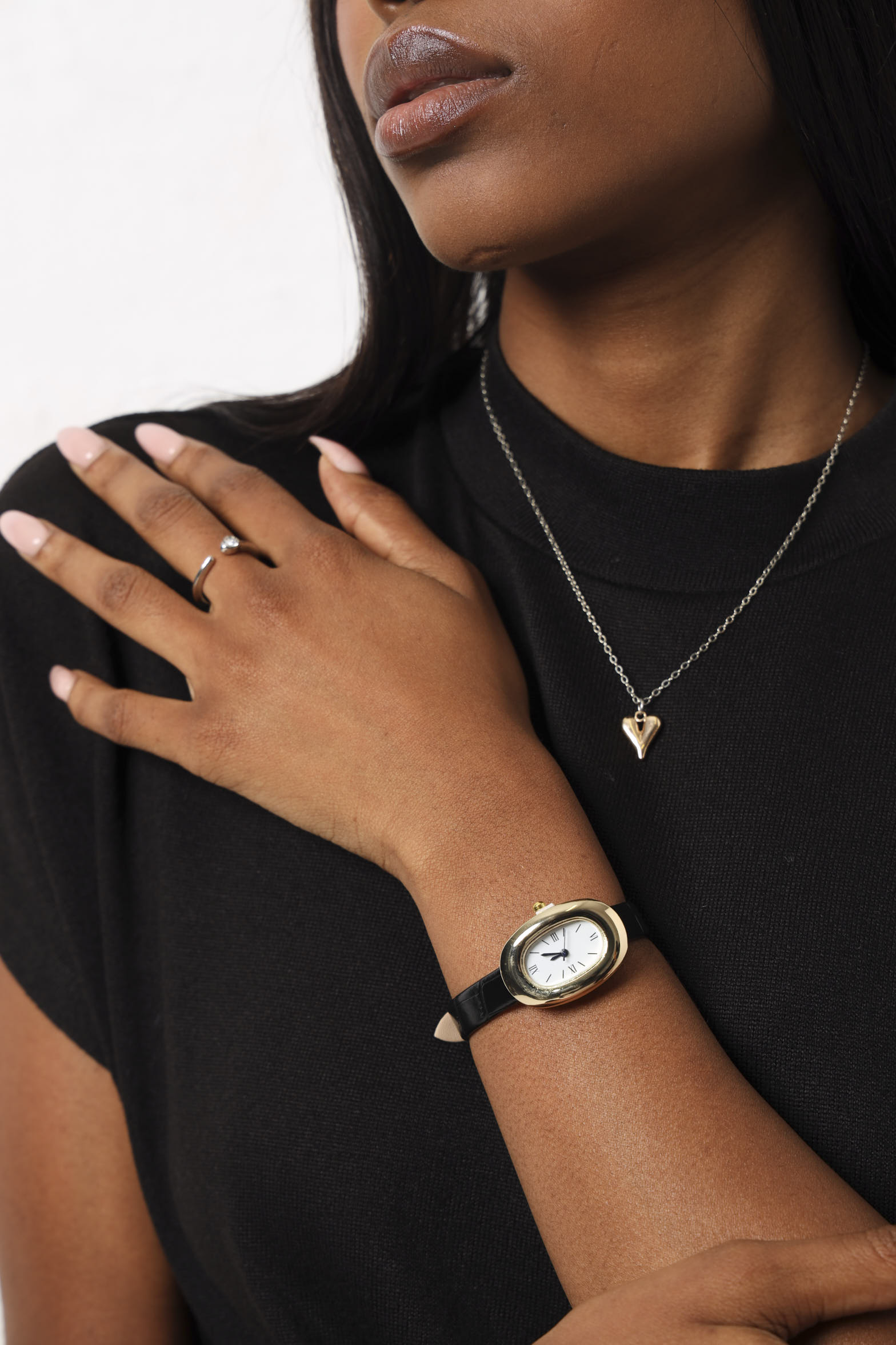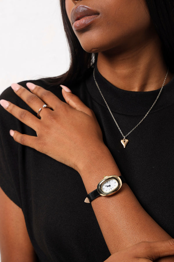 Sleek black oval dial watch with minimalist design. Timeless elegance meets modern simplicity the perfect accessory for any occasion. Understated sophistication that complements every style.