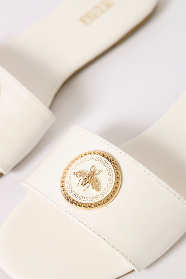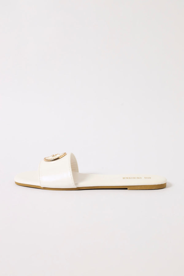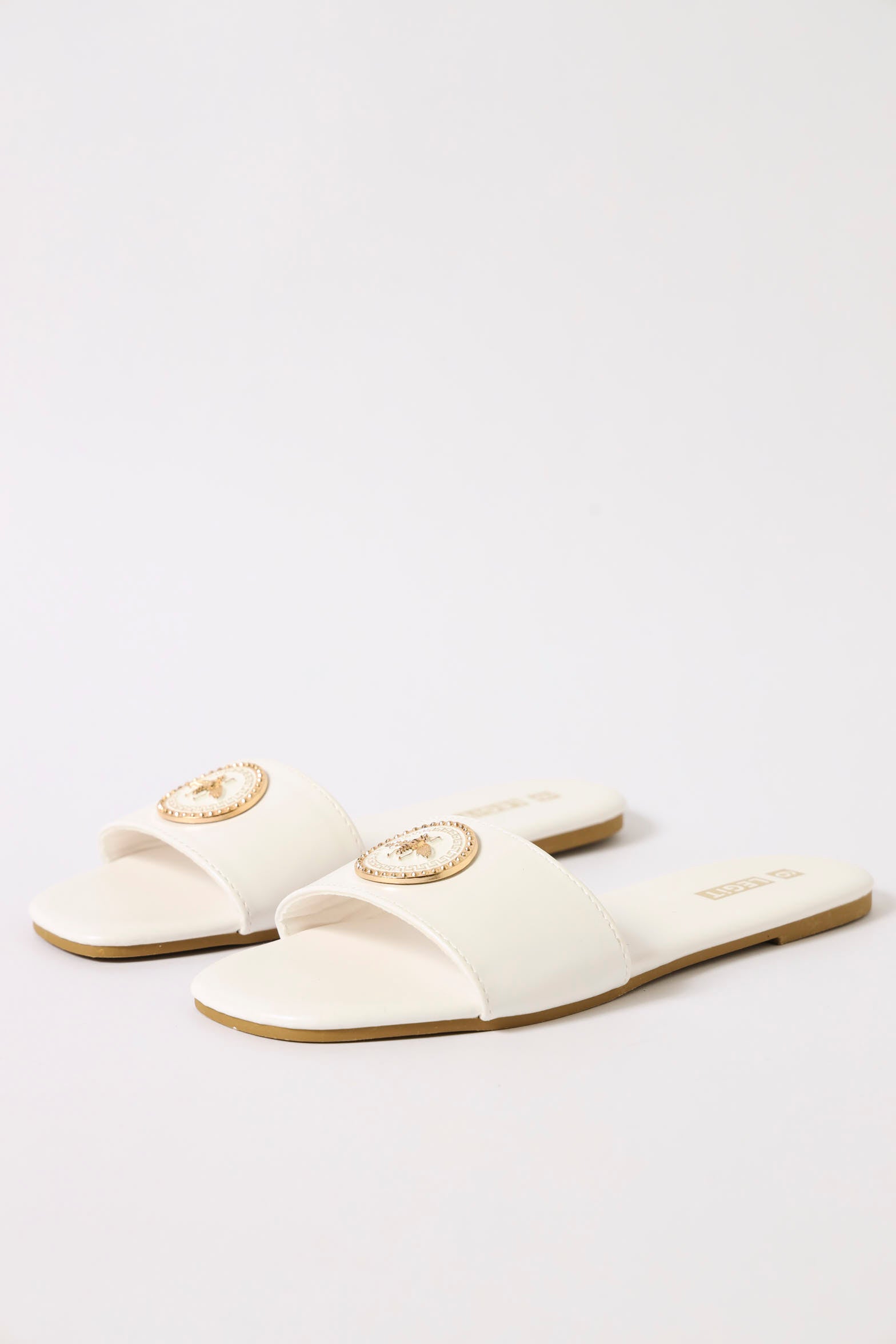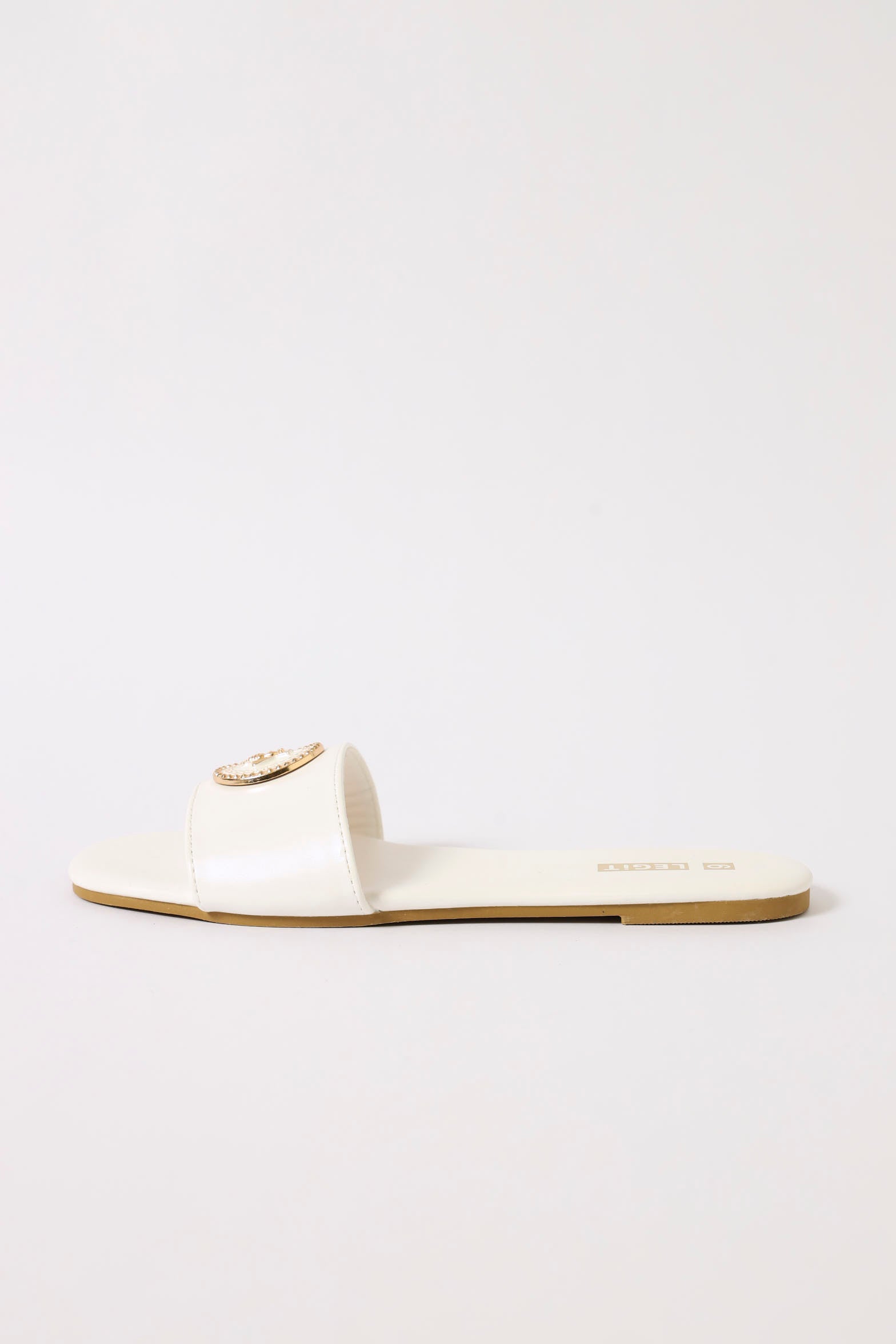 Make a personalized statement with these off-white one-strap sandals featuring a chic monogram disc detail that adds instant sophistication. The single strap design keeps things streamlined and modern while the flat sole ensures all-day comfort without sacrificing style. The monogram element brings a custom, curated feel that makes these sandals uniquely yours. Perfect for casual outings, beach days, or whenever you want to look effortlessly polished—these sandals prove that sometimes the simplest designs make the biggest impact.