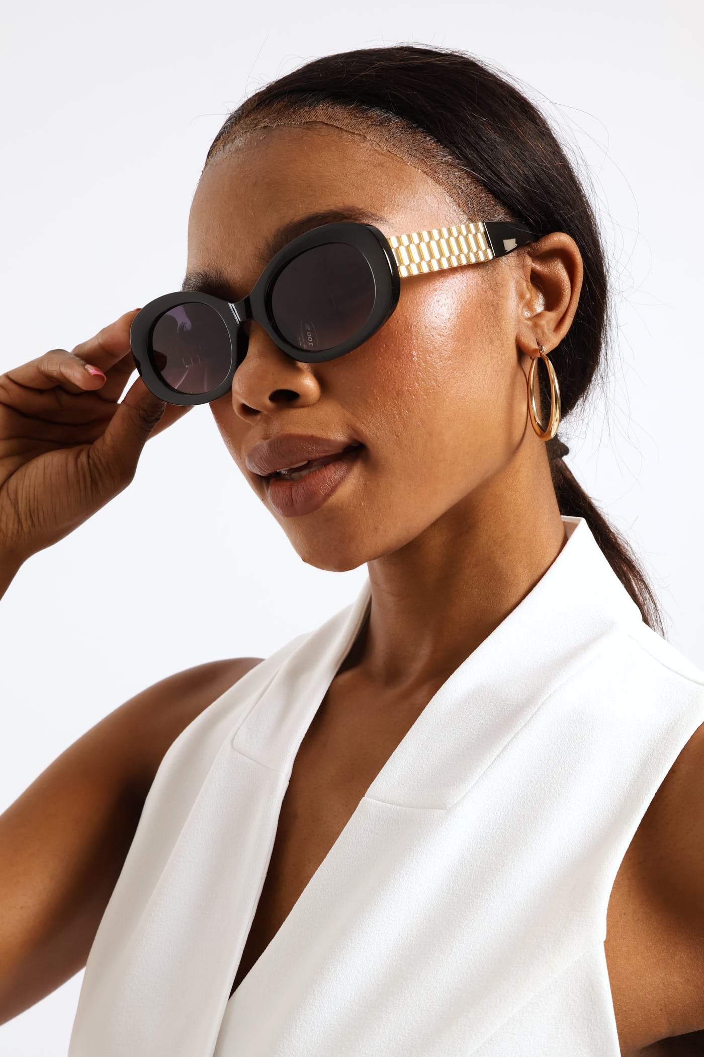 Step into the spotlight with these Oval Metal Trim Temple Sunglasses in sleek black. Their stylish metal trim adds an edgy twist, while the oval lenses bring a retro vibe. Perfect for turning heads and adding a cool, playful flair to any outfit—because why blend in when you can stand out?