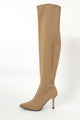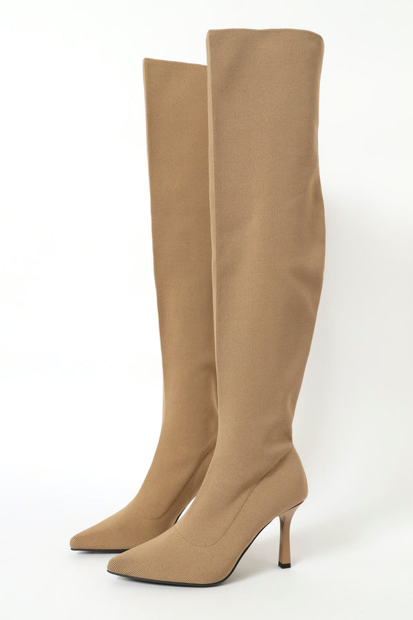 This taupe over-the-knee knitted sock boot embodies contemporary elegance with its form-fitting knit construction and poised heeled profile. The extended length creates a striking silhouette while maintaining comfort through its stretchy fabric design. Versatile enough for both professional and social settings, it pairs seamlessly with everything from tailored separates to flowing midi pieces. A refined addition to any collection, this boot delivers understated luxury and enduring style for the fashion-conscious individual.