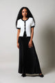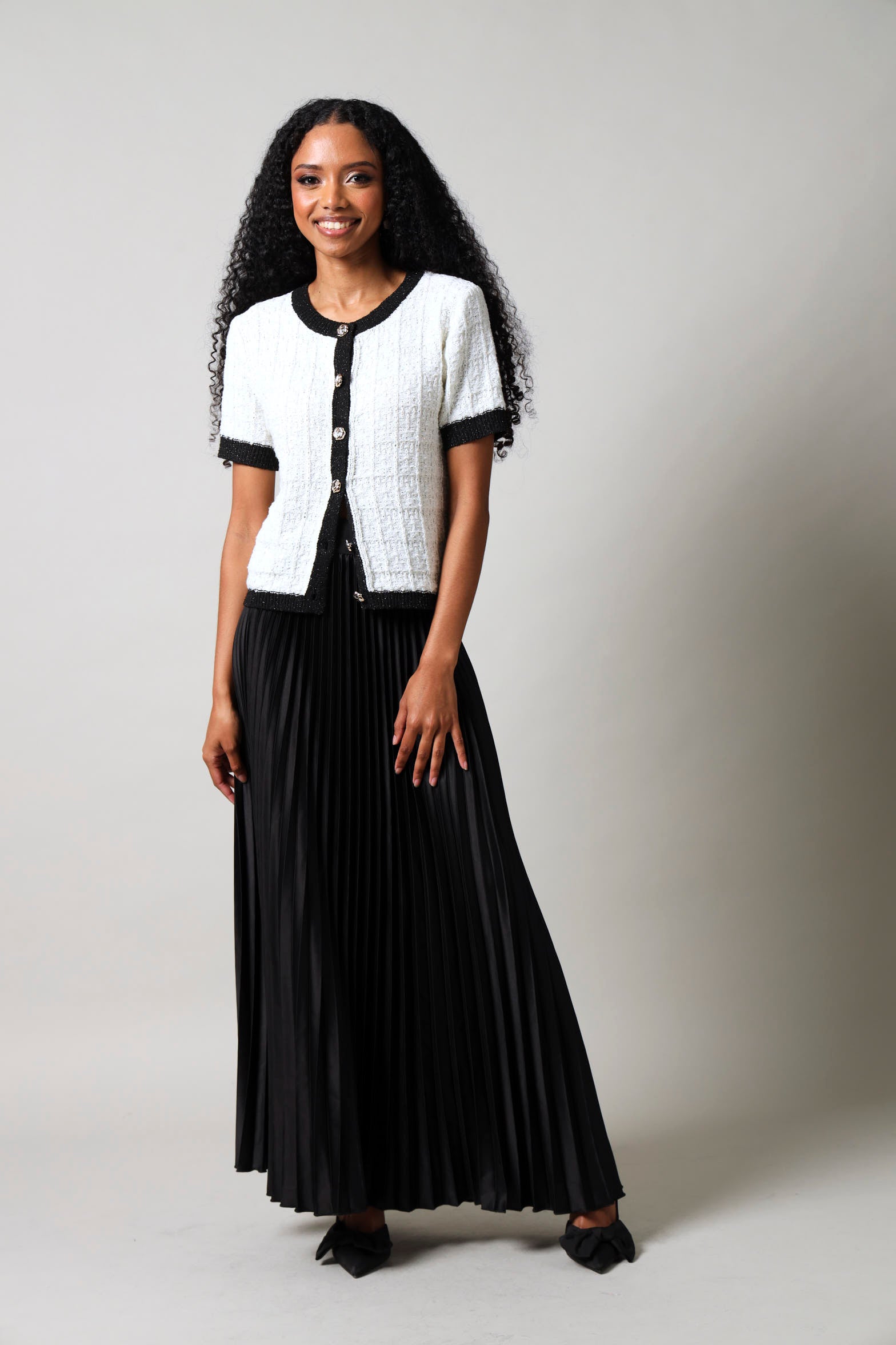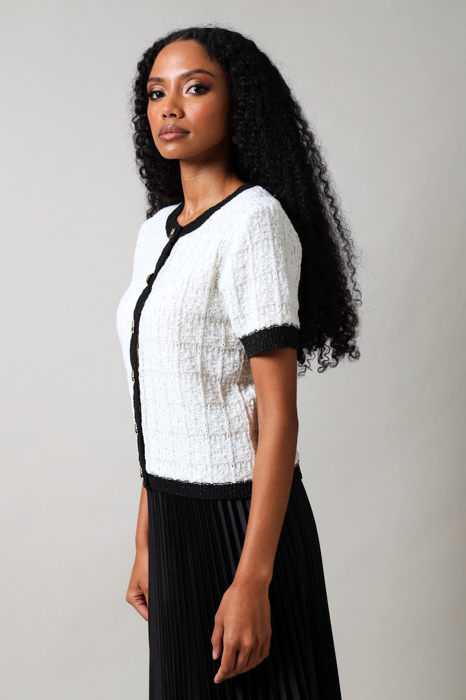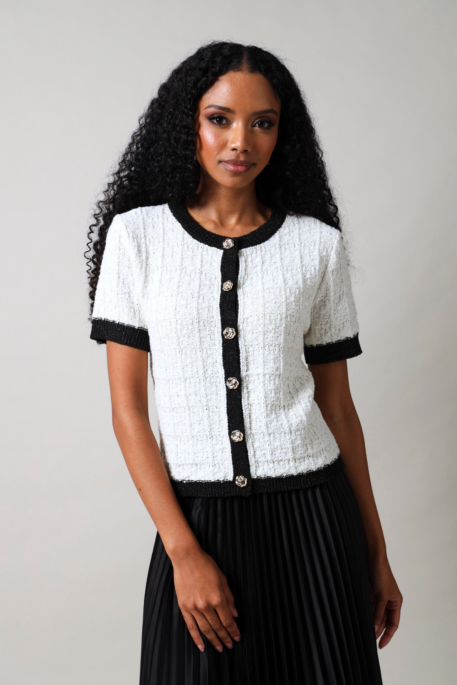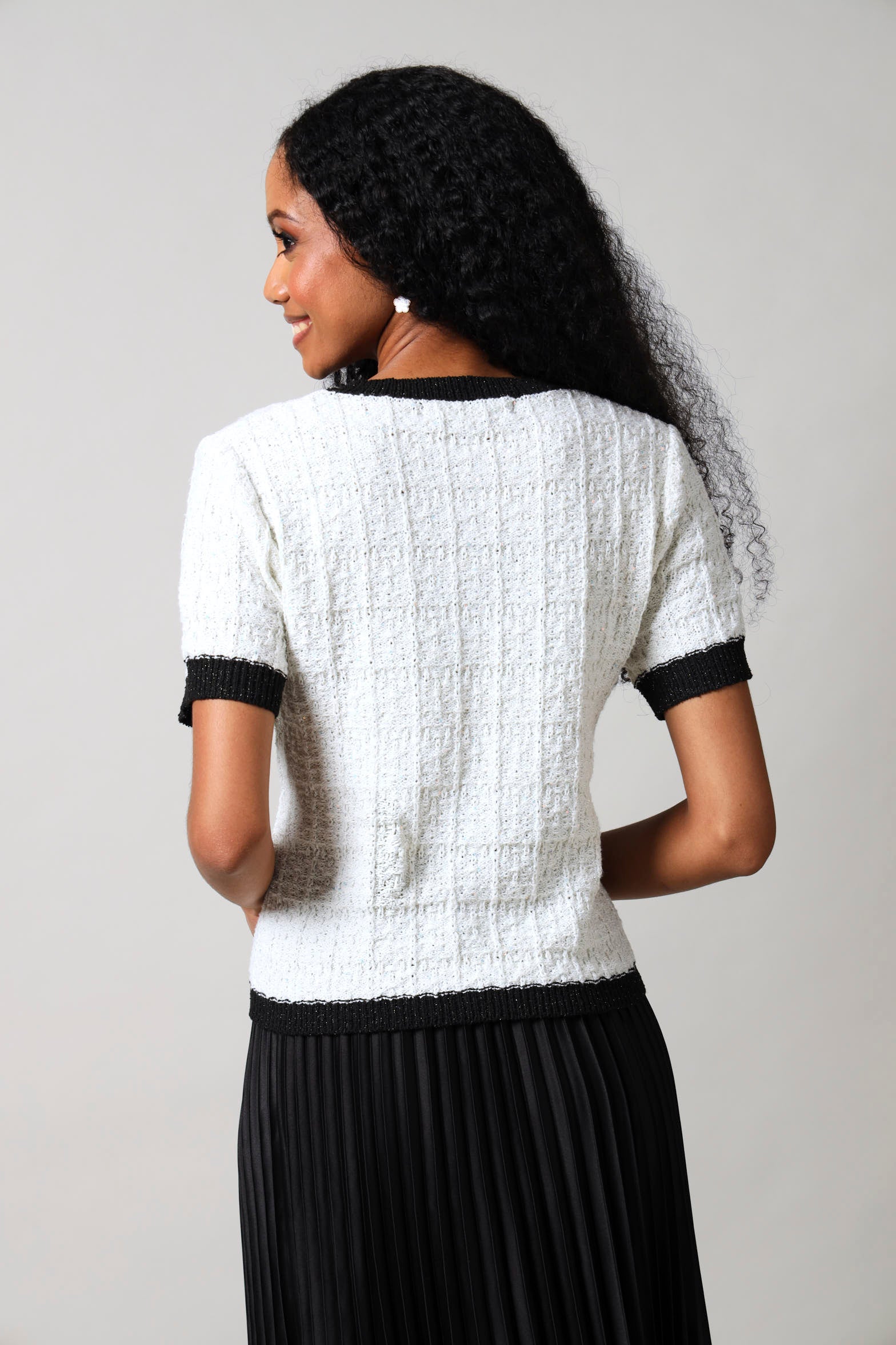 This short sleeve button down knitwear top combines comfort with contemporary style. The crisp white and black colorway offers endless styling possibilities, whether paired with jeans for a casual look or dressed up for evening wear. Made from soft knit material, it features a functional button front and a flattering silhouette that works for various body types. A wardrobe staple that delivers both versatility and effortless sophistication.