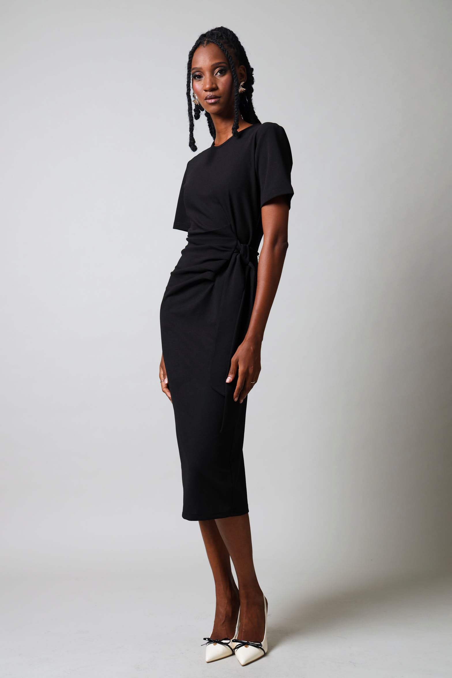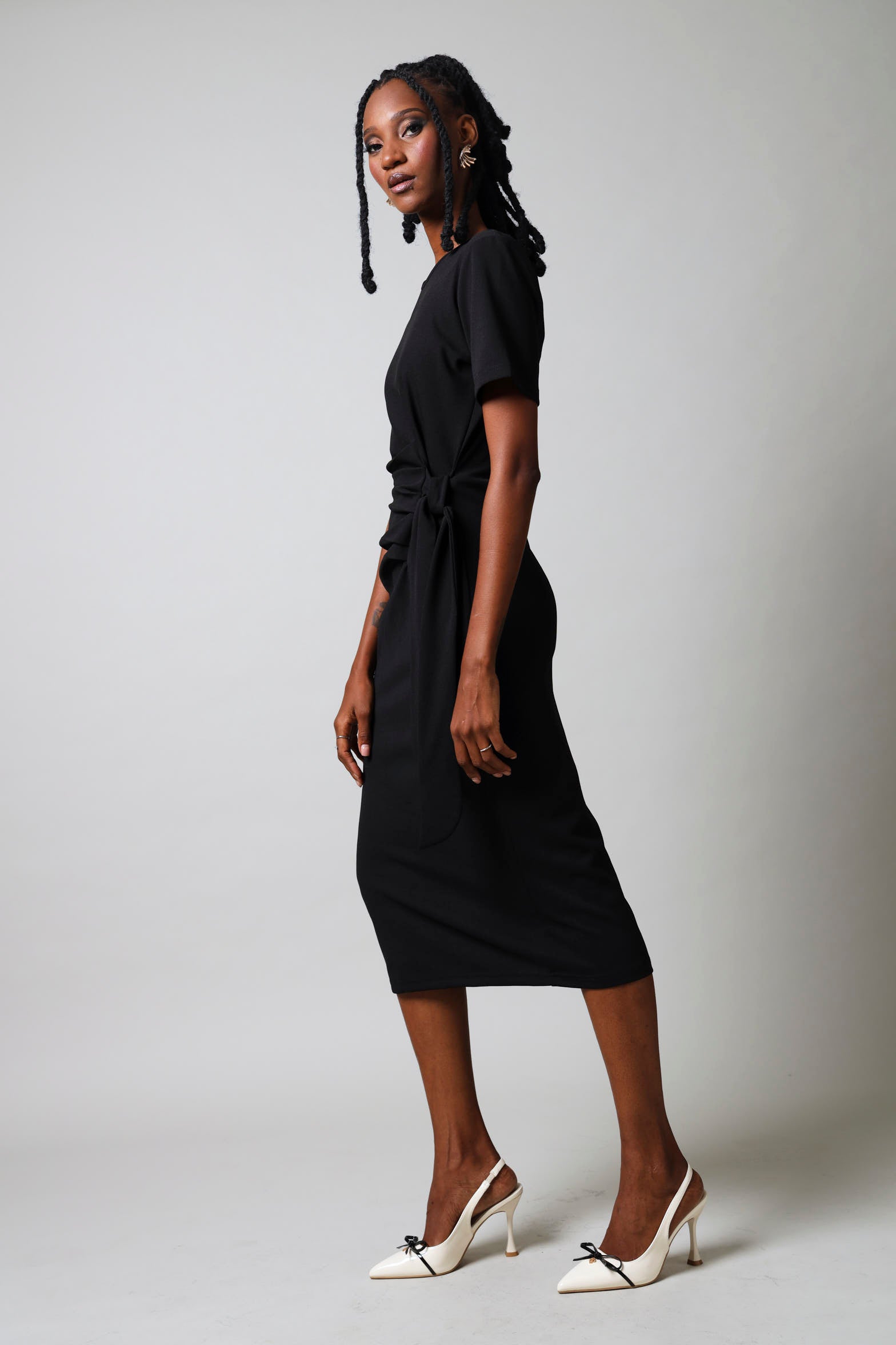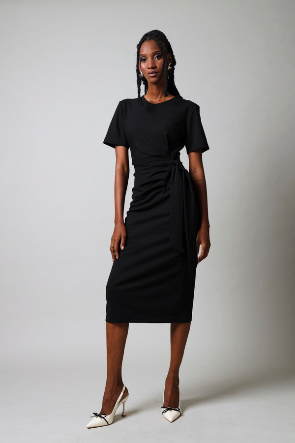 Sleek and flattering, this black bodycon dress features short sleeves and an elegant side tie detail that cinches the waist for a refined silhouette. The form-fitting design hugs your curves while the tie accent adds a touch of contemporary style. Perfect for evening events, date nights, or when you want to feel confident and polished. Crafted for comfort and impact, this versatile piece transitions seamlessly from day to night.