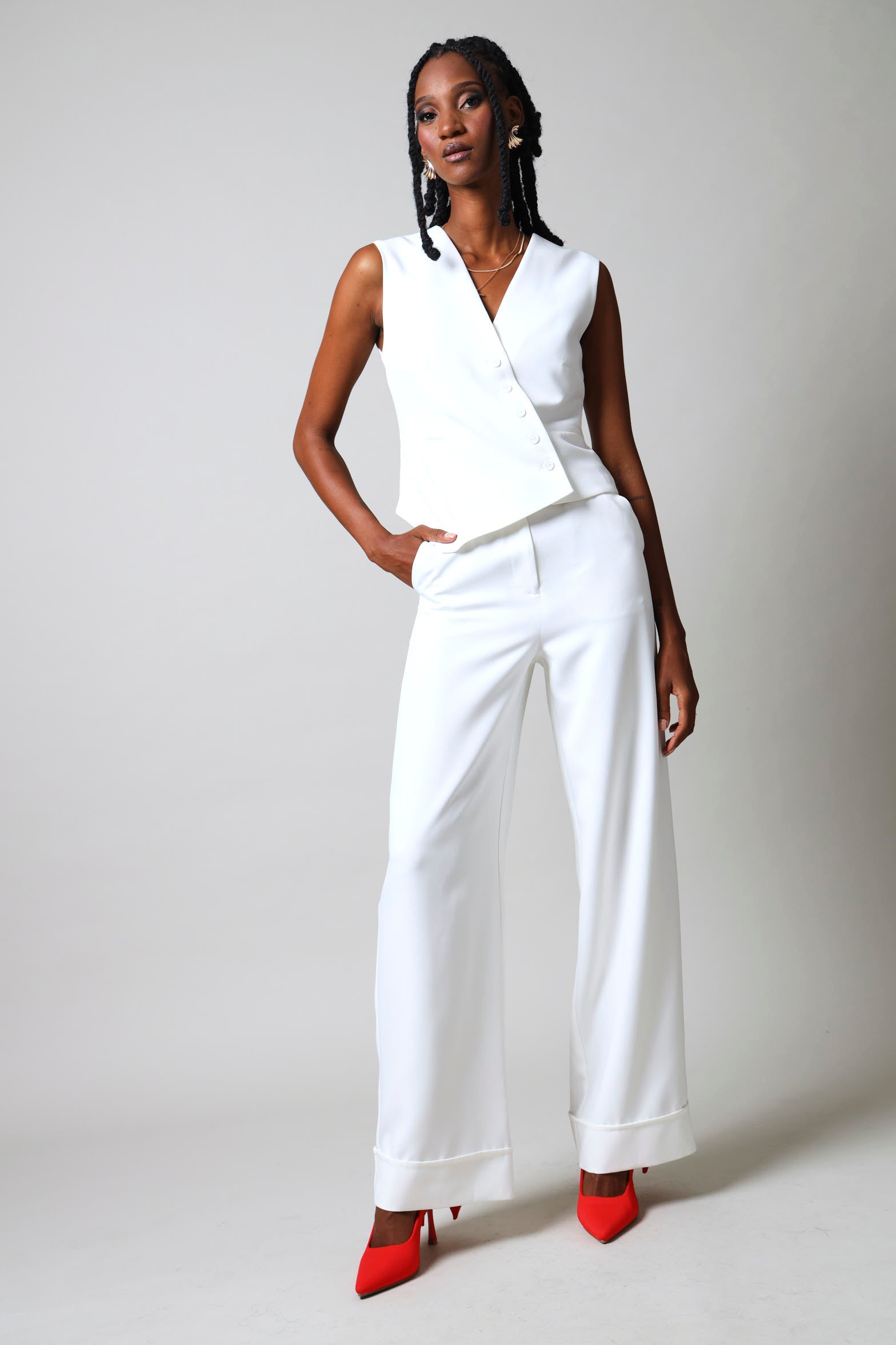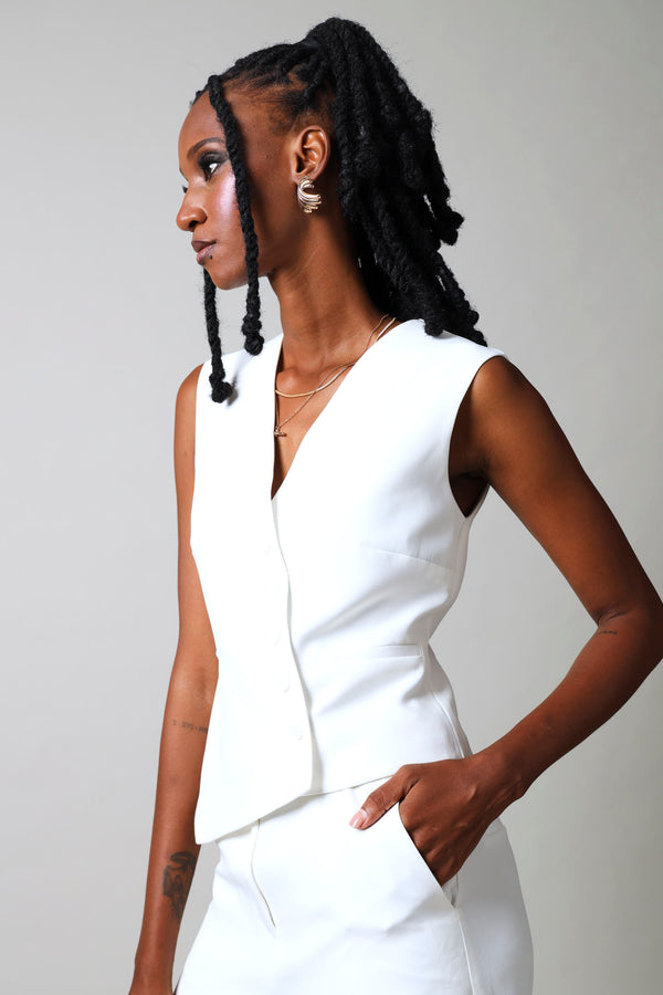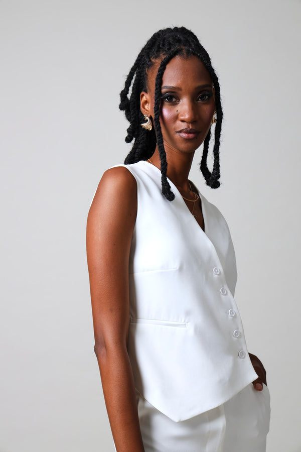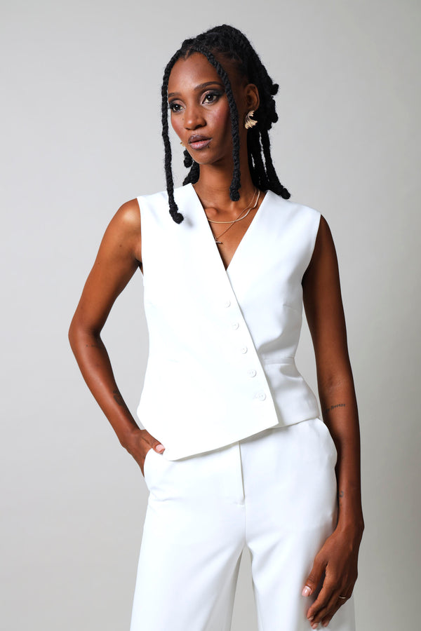 Elevate your wardrobe with this striking sleeveless asymmetrical waistcoat in crisp white. The modern asymmetrical cut creates visual interest and contemporary flair, while the sleeveless design offers versatile layering options. Perfect for adding dimension to tailored looks or casual ensembles, this piece transitions seamlessly from office to evening wear. The clean white palette ensures effortless coordination with your existing collection.