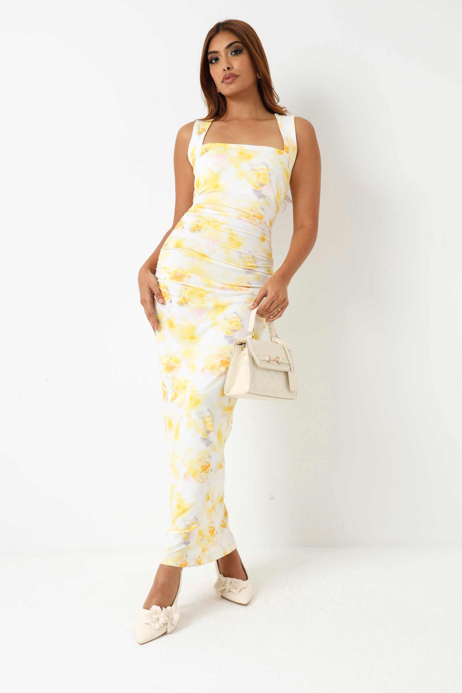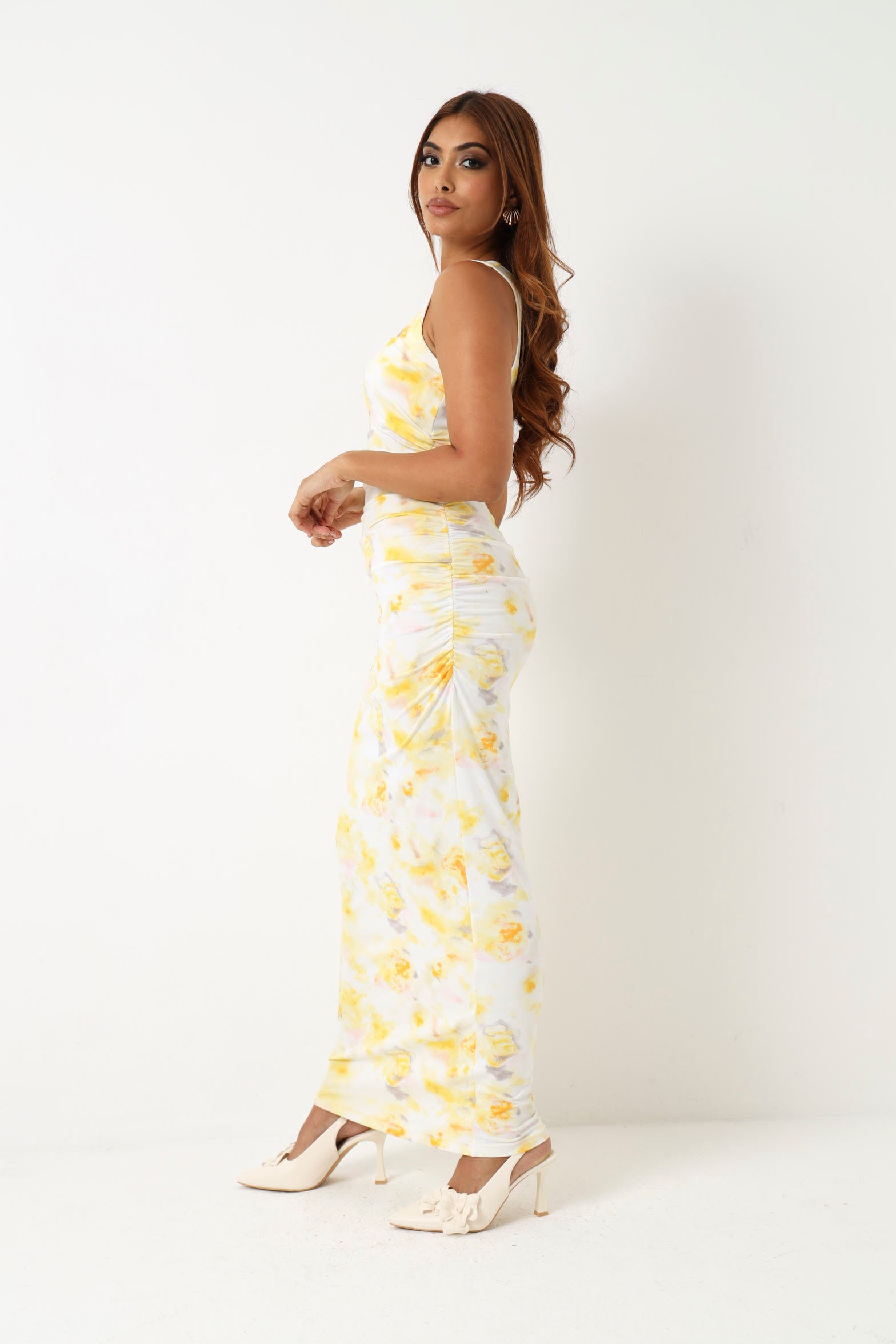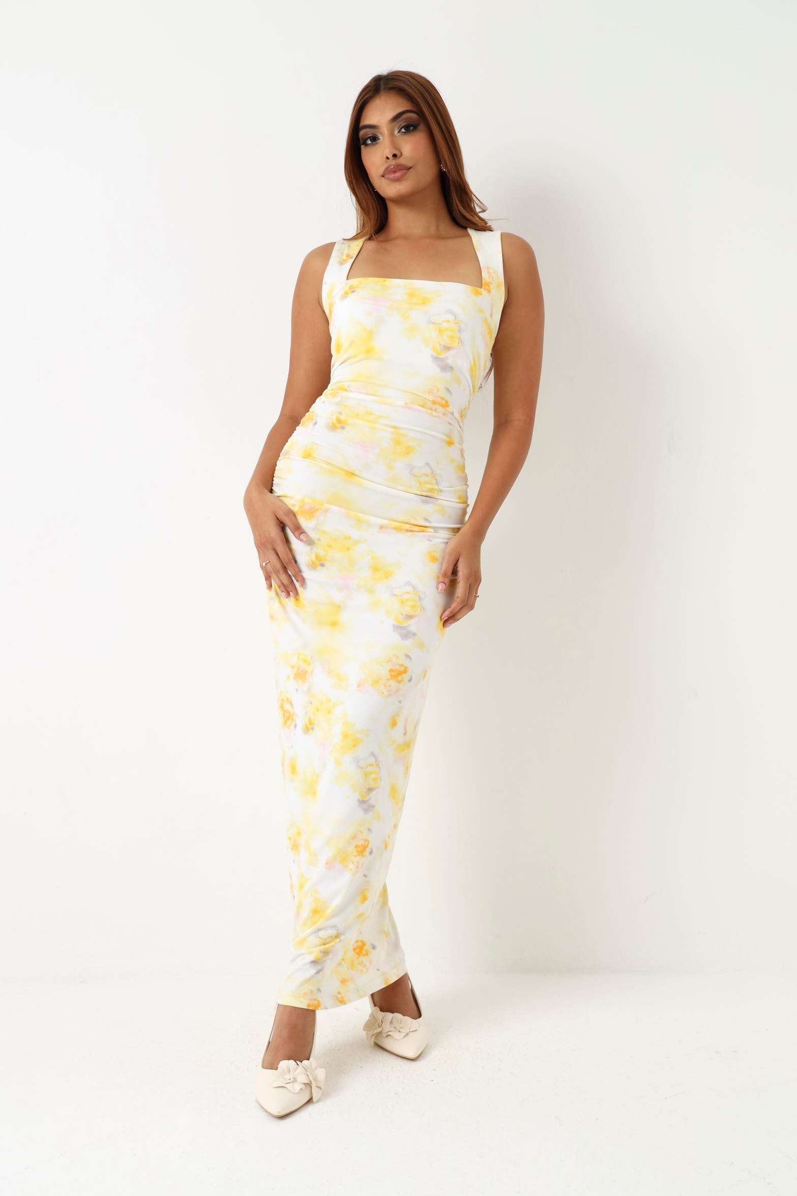 Embrace effortless elegance with this sleeveless floral midi dress in vibrant yellow. The flowing silhouette and midi length create a flattering, versatile look perfect for warm weather occasions. Delicate floral patterns add feminine charm, while the sleeveless design keeps you cool and comfortable. Ideal for garden parties, casual outings, or dressed up for evening events. A timeless piece that transitions seamlessly from day to night.
