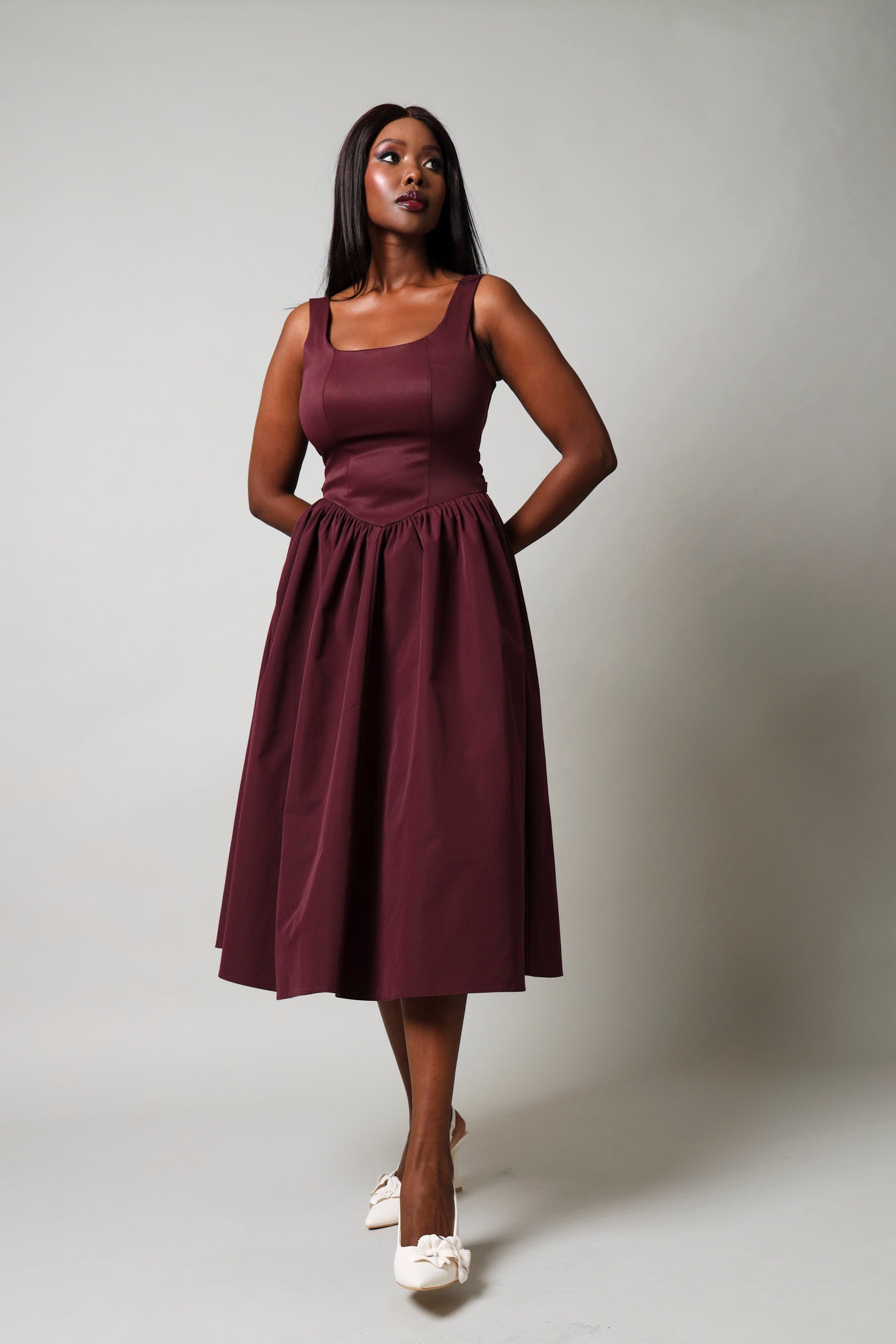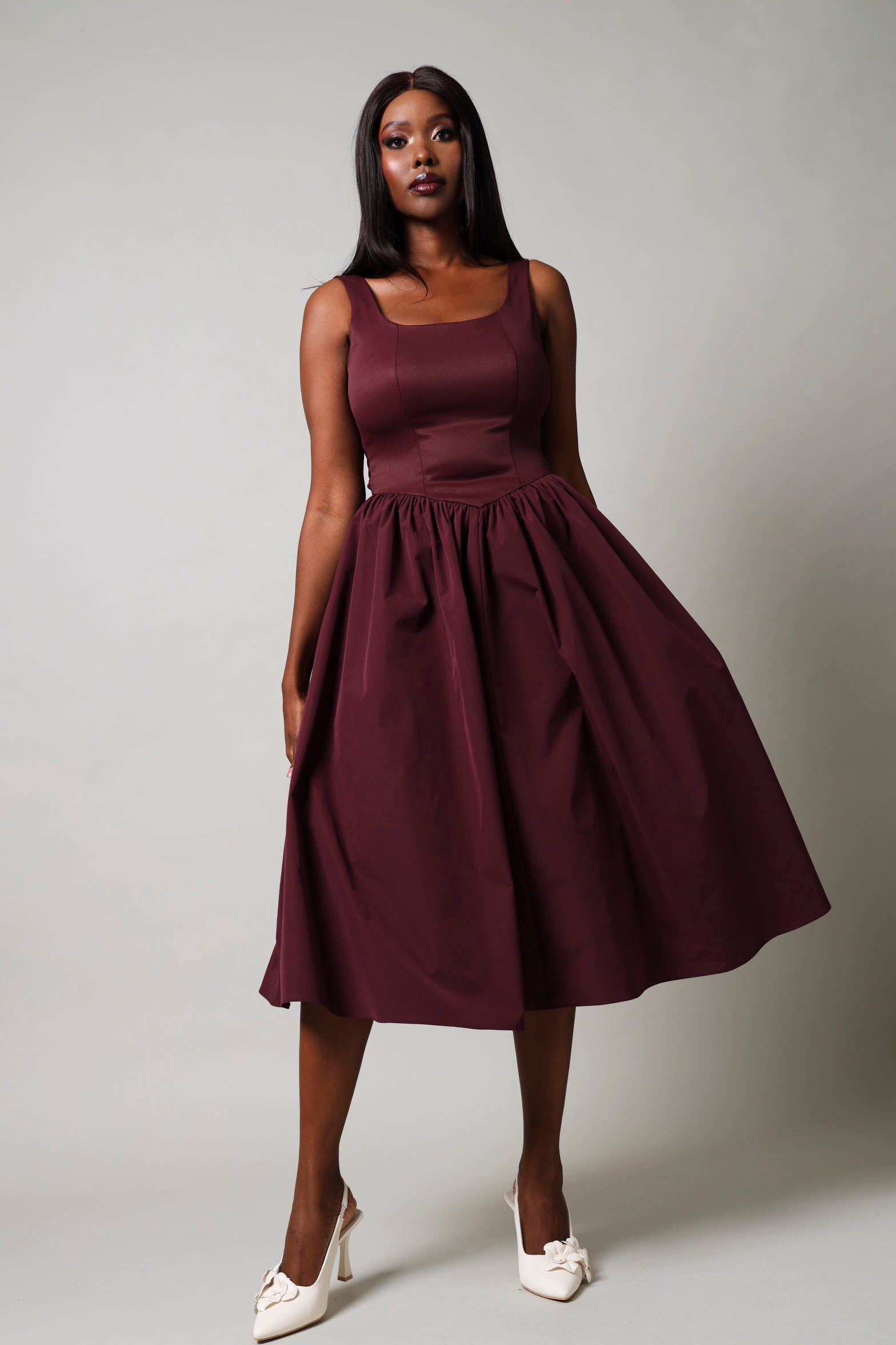 Make a stunning entrance in this elegant sleeveless prom dress in rich burgundy. The timeless silhouette features a flattering cut designed to showcase your natural beauty, while the luxurious fabric drapes gracefully for effortless sophistication. Perfect for prom night, formal events, or any special occasion where you want to feel confident and radiant. This versatile piece pairs beautifully with statement jewellery and classic heels for a look that's unmistakably you.