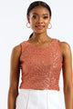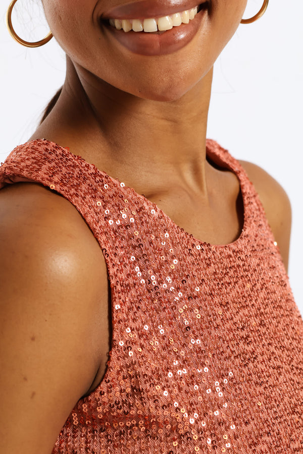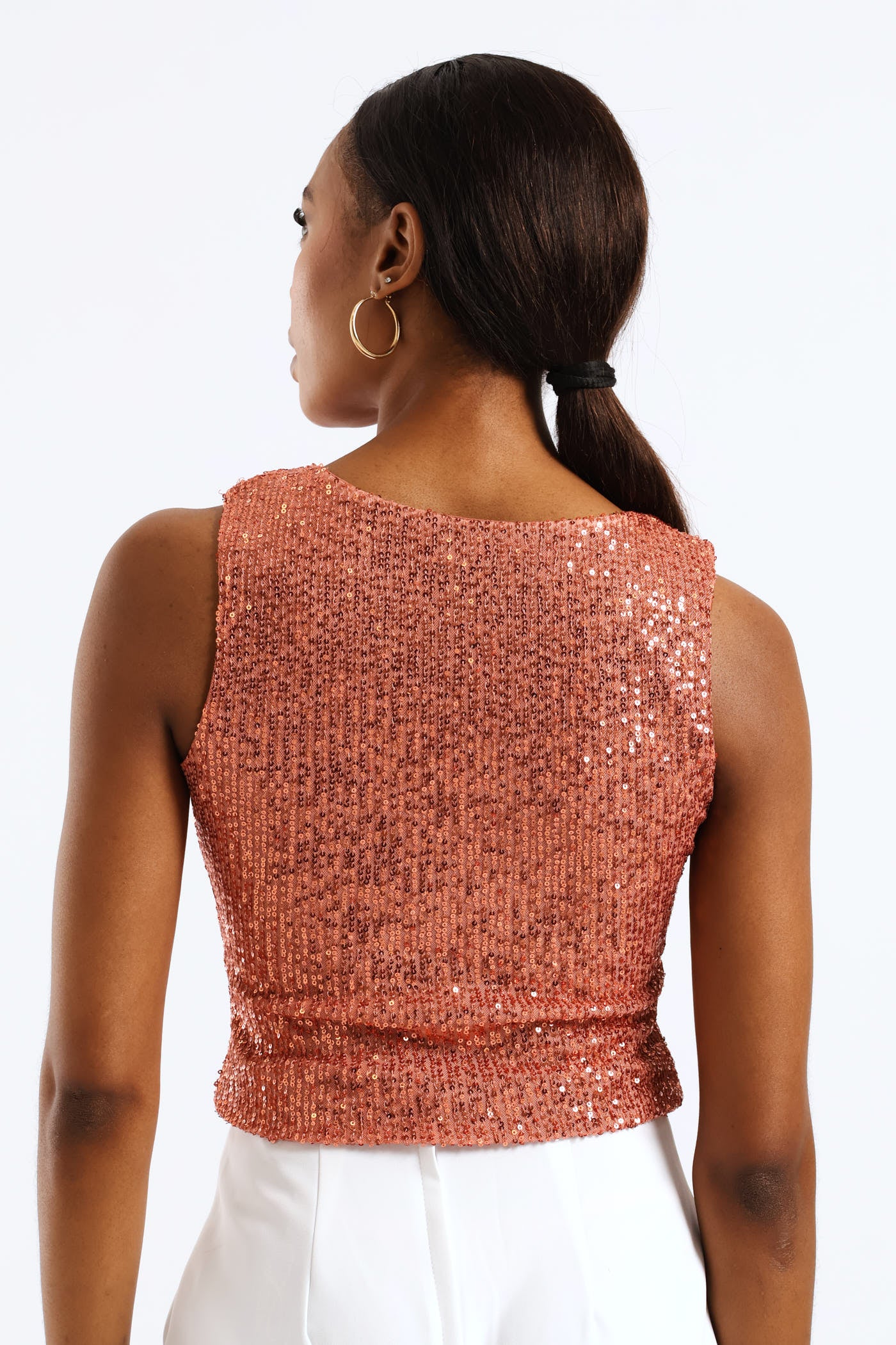 Shine bright in this sleeveless sequin top that’s pure gold magic! Perfect for dancing the night away or adding a dazzling twist to your daytime look, it catches every eye with its sparkling finish. Lightweight and fun, it’s your new go-to for effortless glam that never fades.