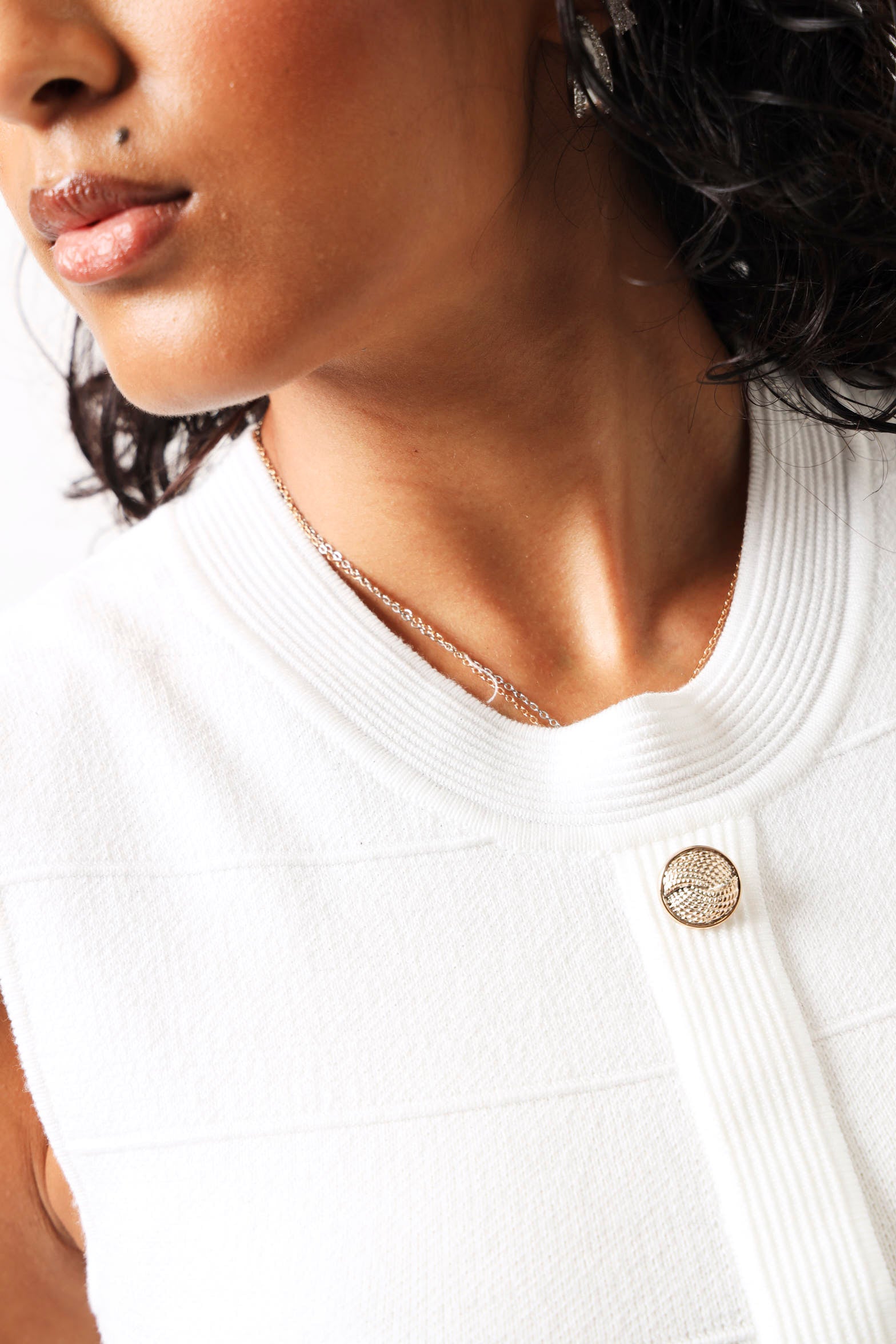 A masterclass in understated elegance, this white sleeveless knitwear dress features a distinctive textured weave that catches the light with subtle sophistication. The clean, unadorned neckline and armholes create a refined canvas, while the structured knit fabric provides both comfort and a flattering drape. Ideal for building a capsule wardrobe, this piece pairs effortlessly with tailored jackets, statement jewellery, or worn alone for quiet confidence. A wardrobe essential for those who favour quality over trends.