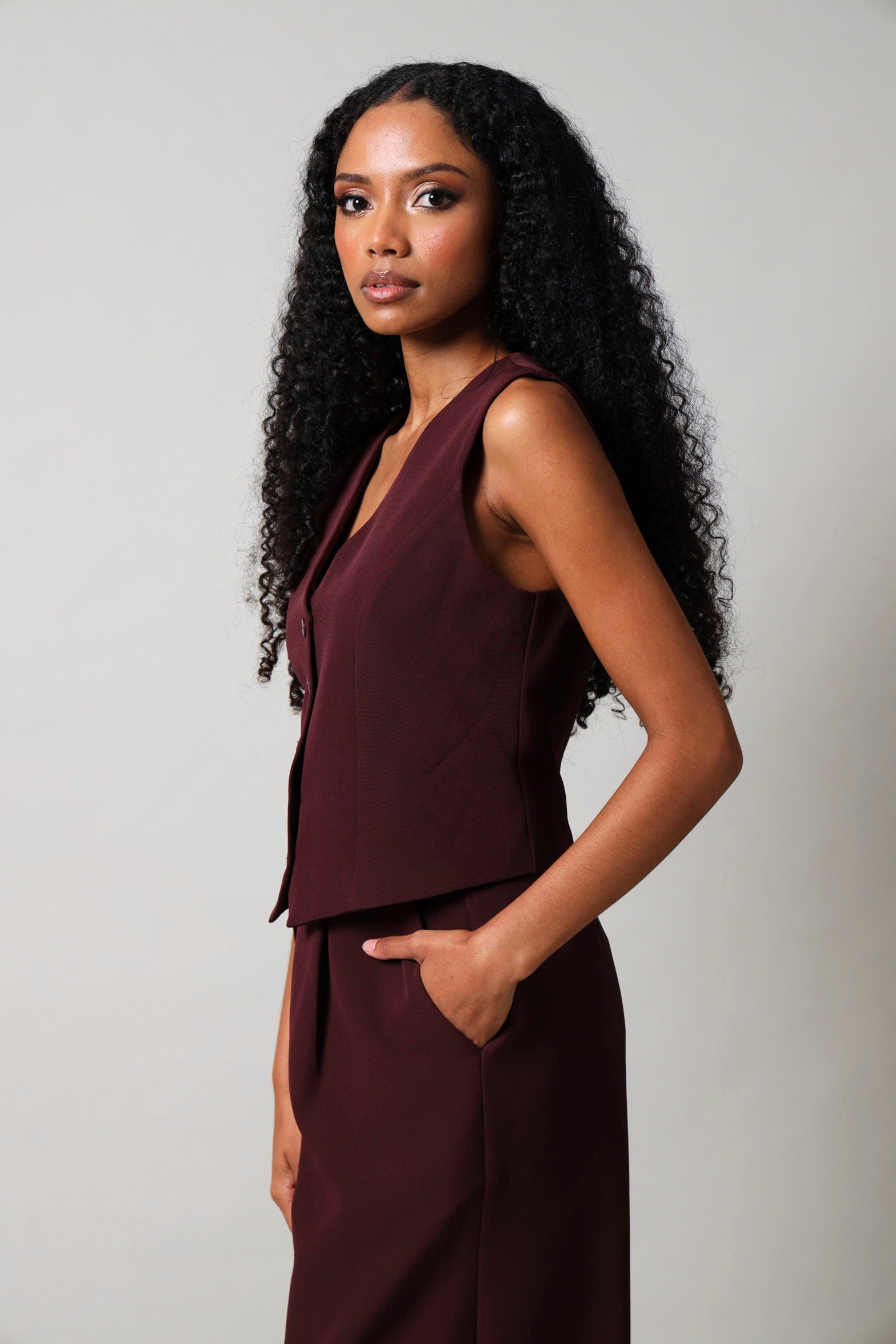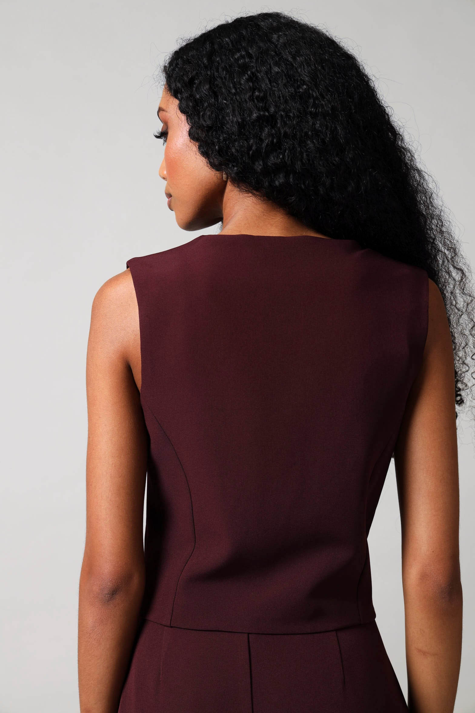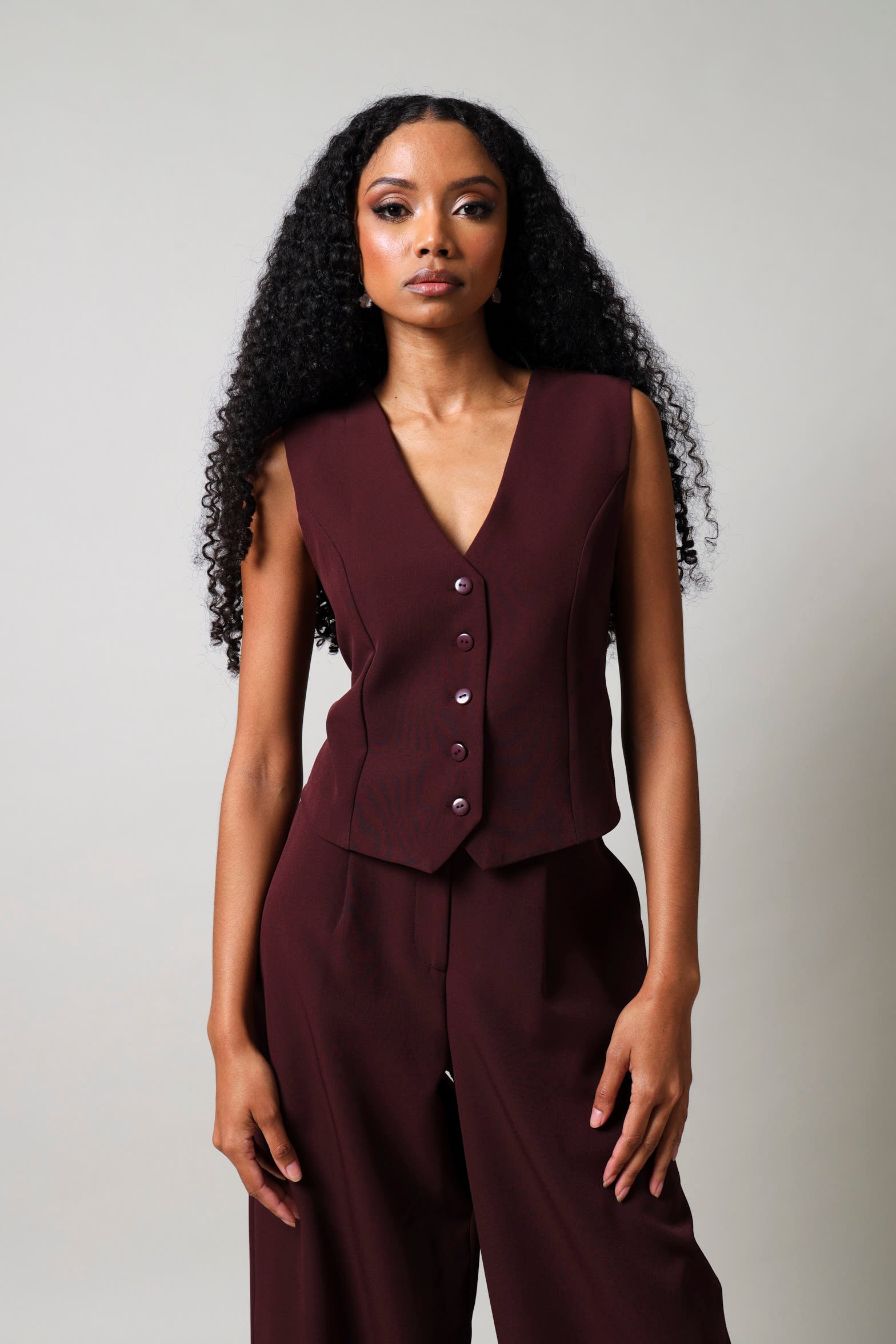 Sleeveless V Neck Button Down Waistcoat - Burgundy