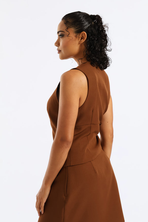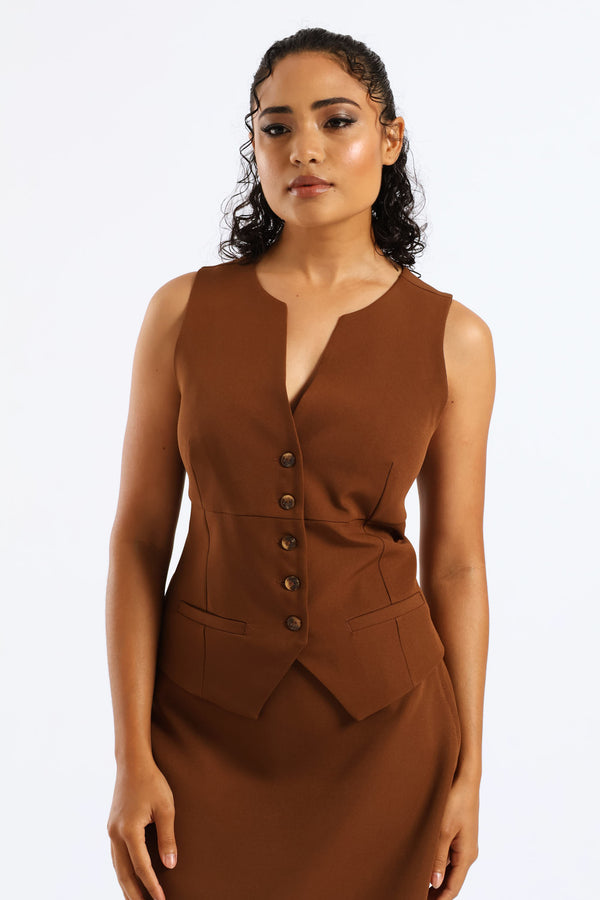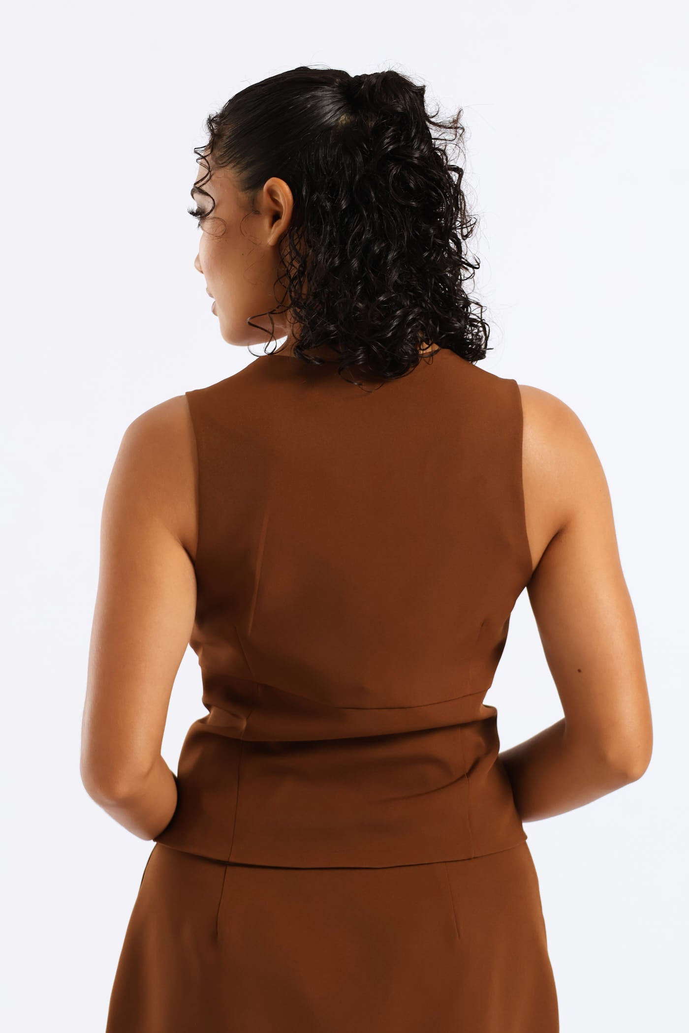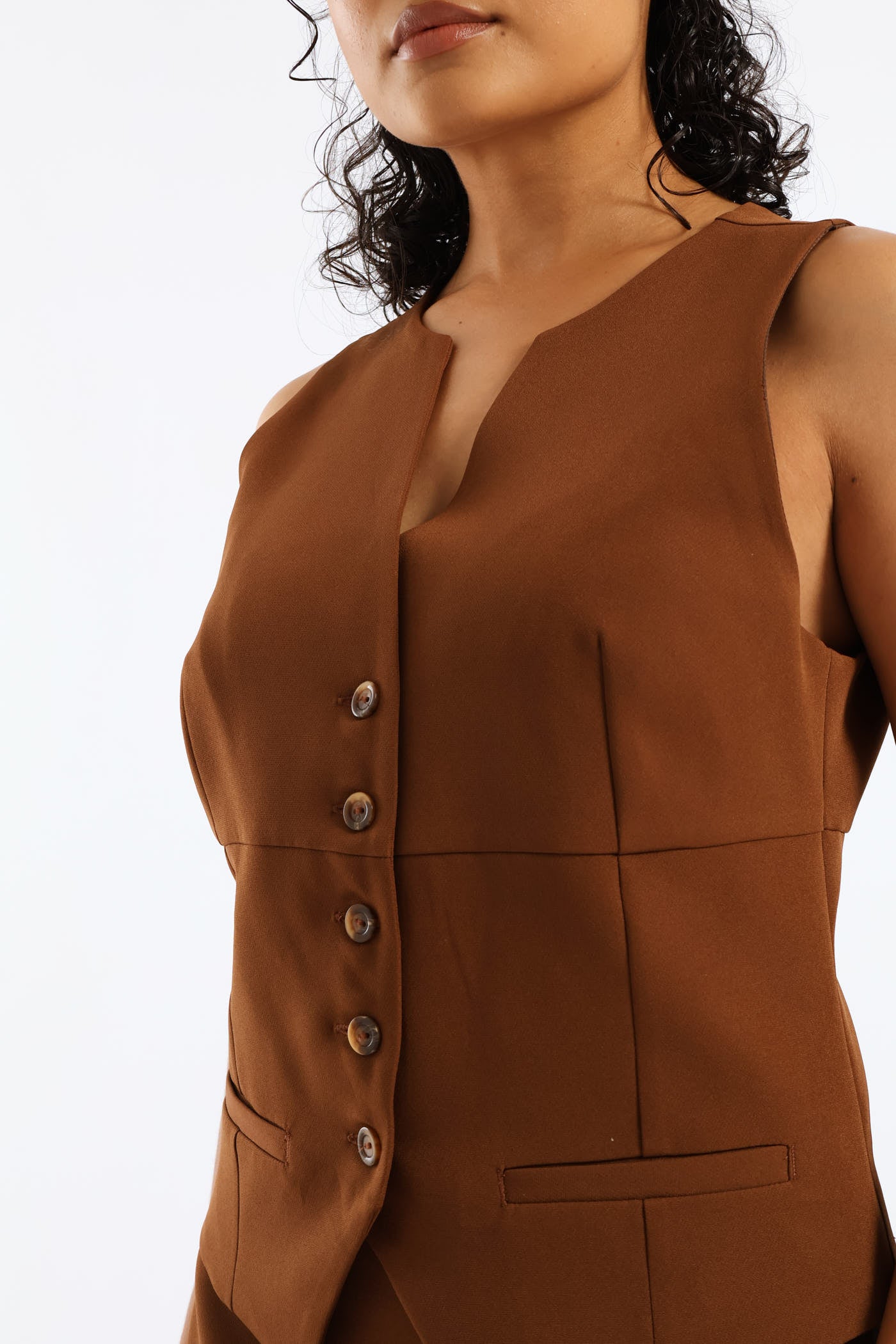 Give your outfit a cheeky upgrade with this brown sleeveless waistcoat. Perfect for layering, it adds a playful pop of sophistication and a touch of tailored charm. Whether over a tee or a blouse, it’s your new go-to for mixing classic vibes with fresh flair.