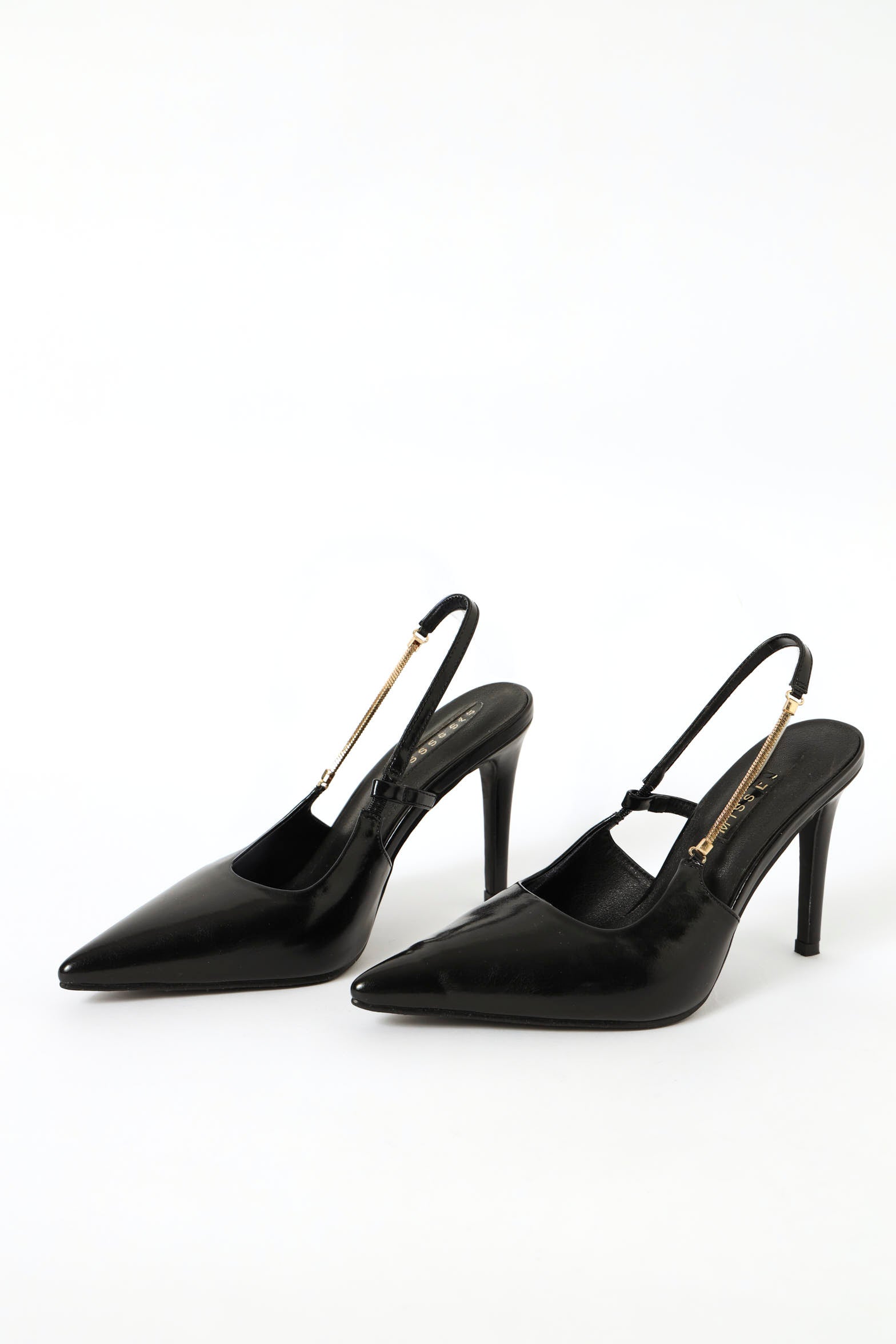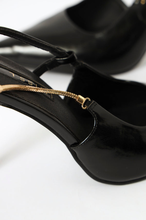 Sophisticated black stiletto with an ornate snake chain slingback detail. The elegant heel and secure ankle strap deliver both style and stability for refined occasions.