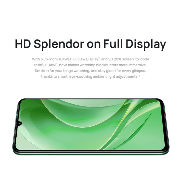 HUAWEI nova Y70‘s 6,000 mAh battery only needs to be charged once every days. You can even wring another 12 hours out of just 5% – that's some serious staying power! Need a boost? 22.5 W HUAWEI SuperCharge will give 3 hours of video on just 10 minutes of juice!