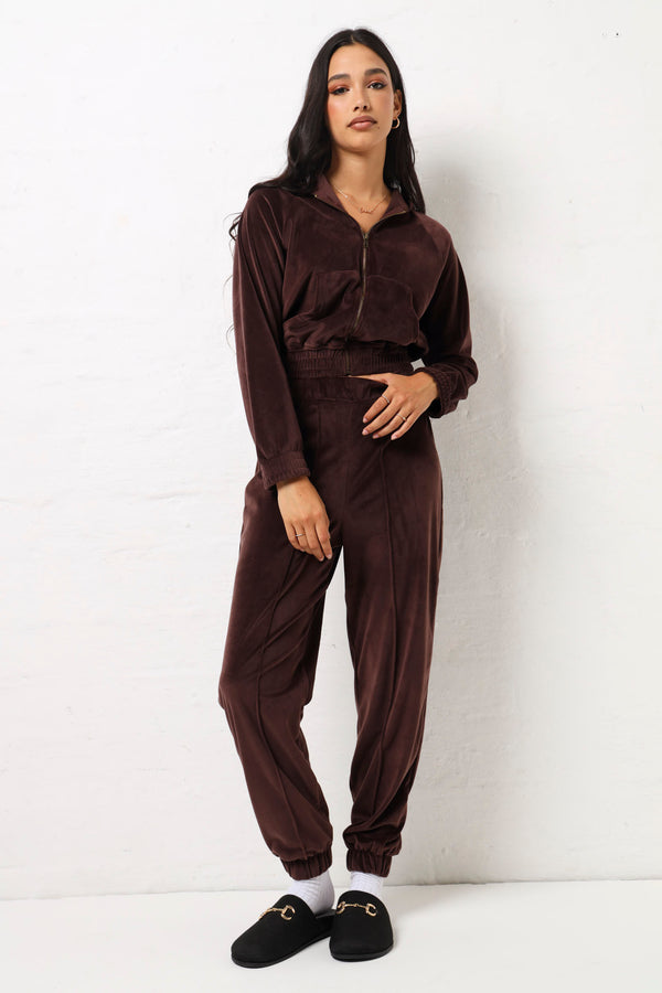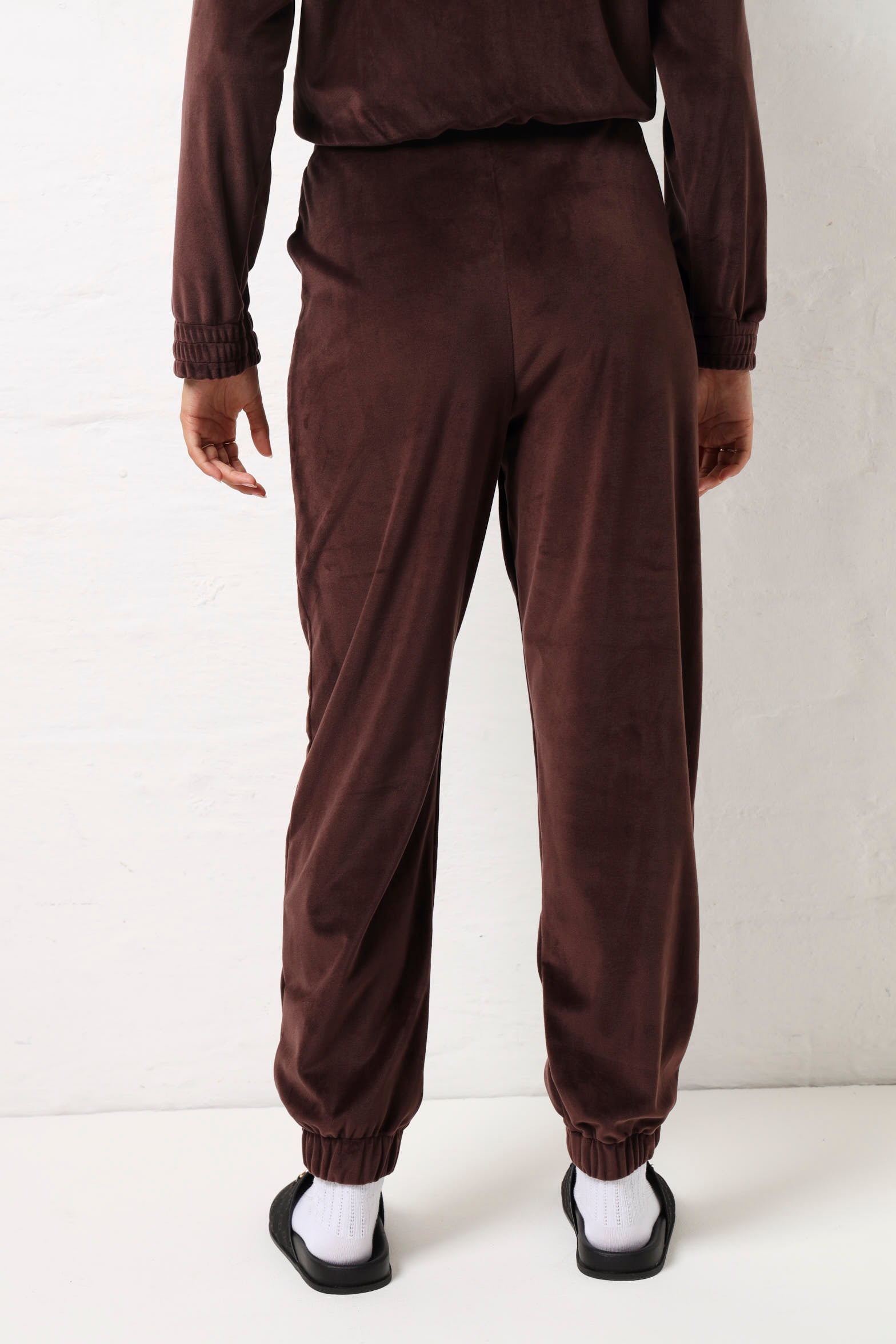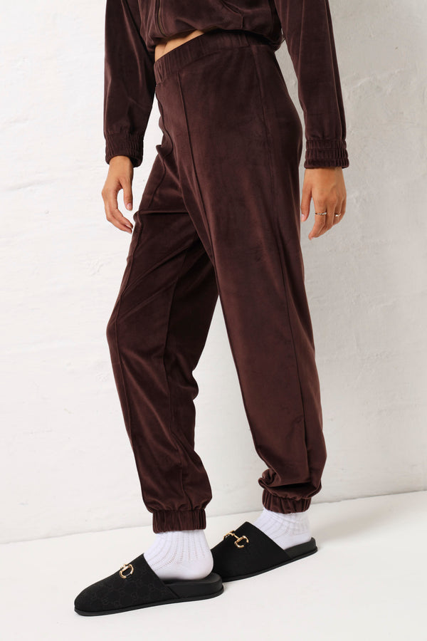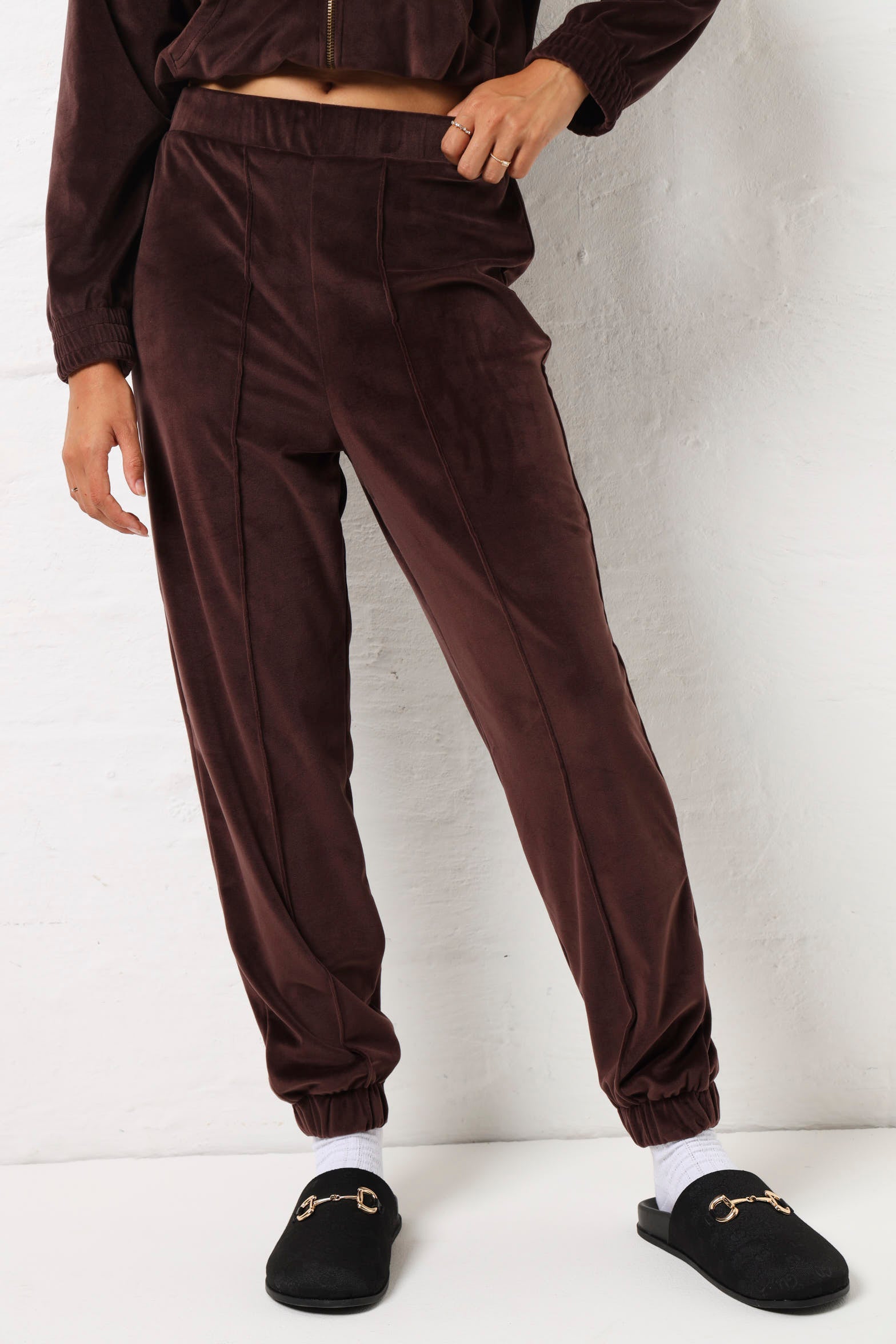 Sink into pure comfort with our Velour Jogger in rich chocolate. This plush essential features a soft velour fabric that feels as good as it looks, paired with an elastic waistband and tapered ankles for that effortlessly chic vibe. Perfect for lounging at home, running errands, or styling up with your favorite sneakers. The chocolate hue is versatile enough to match everything in your wardrobe, making these joggers your new go-to for cozy-meets-cool days.