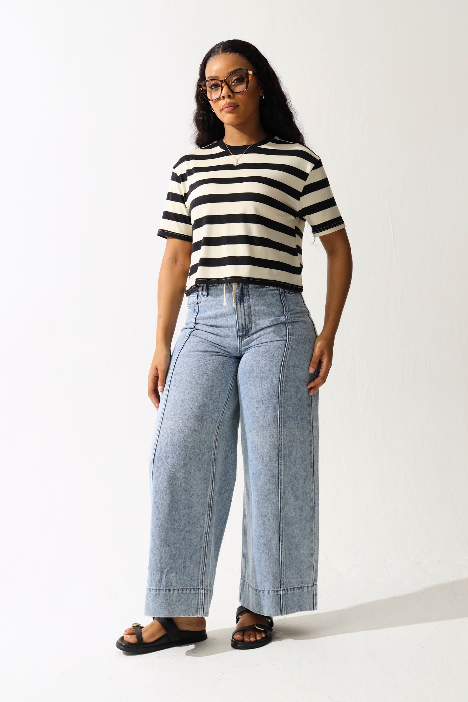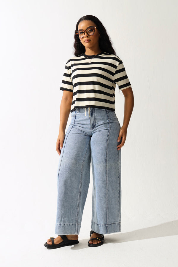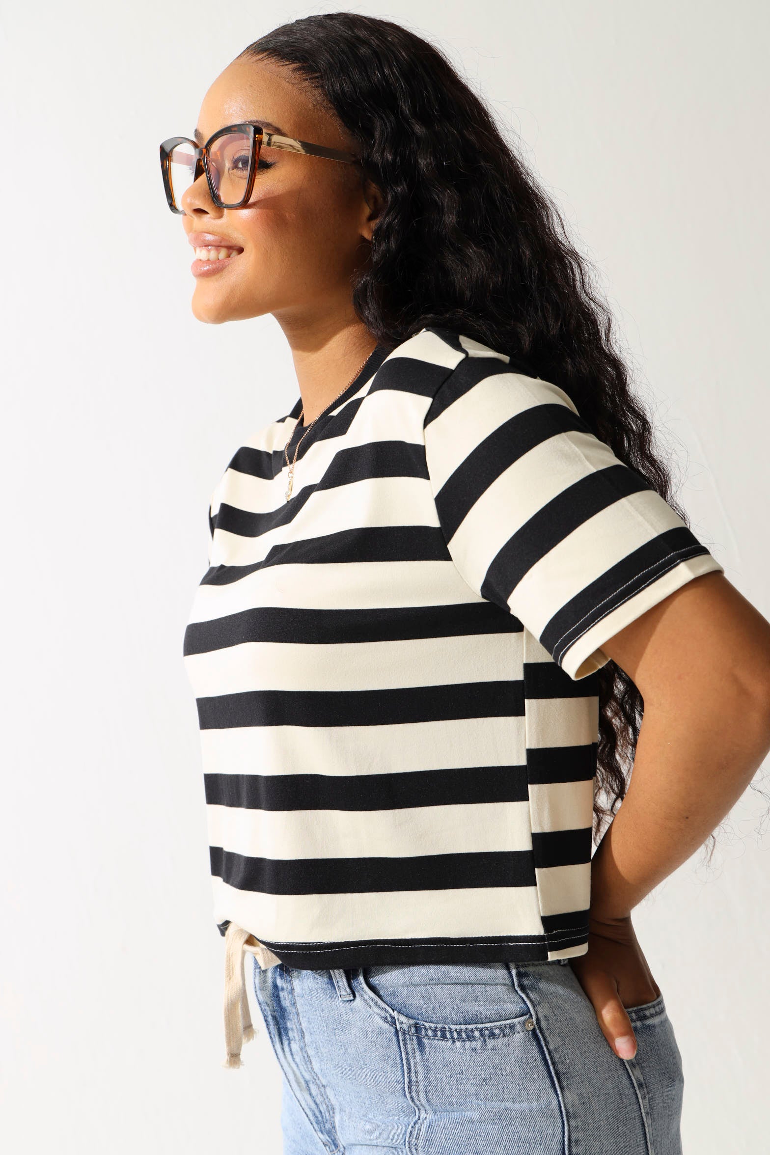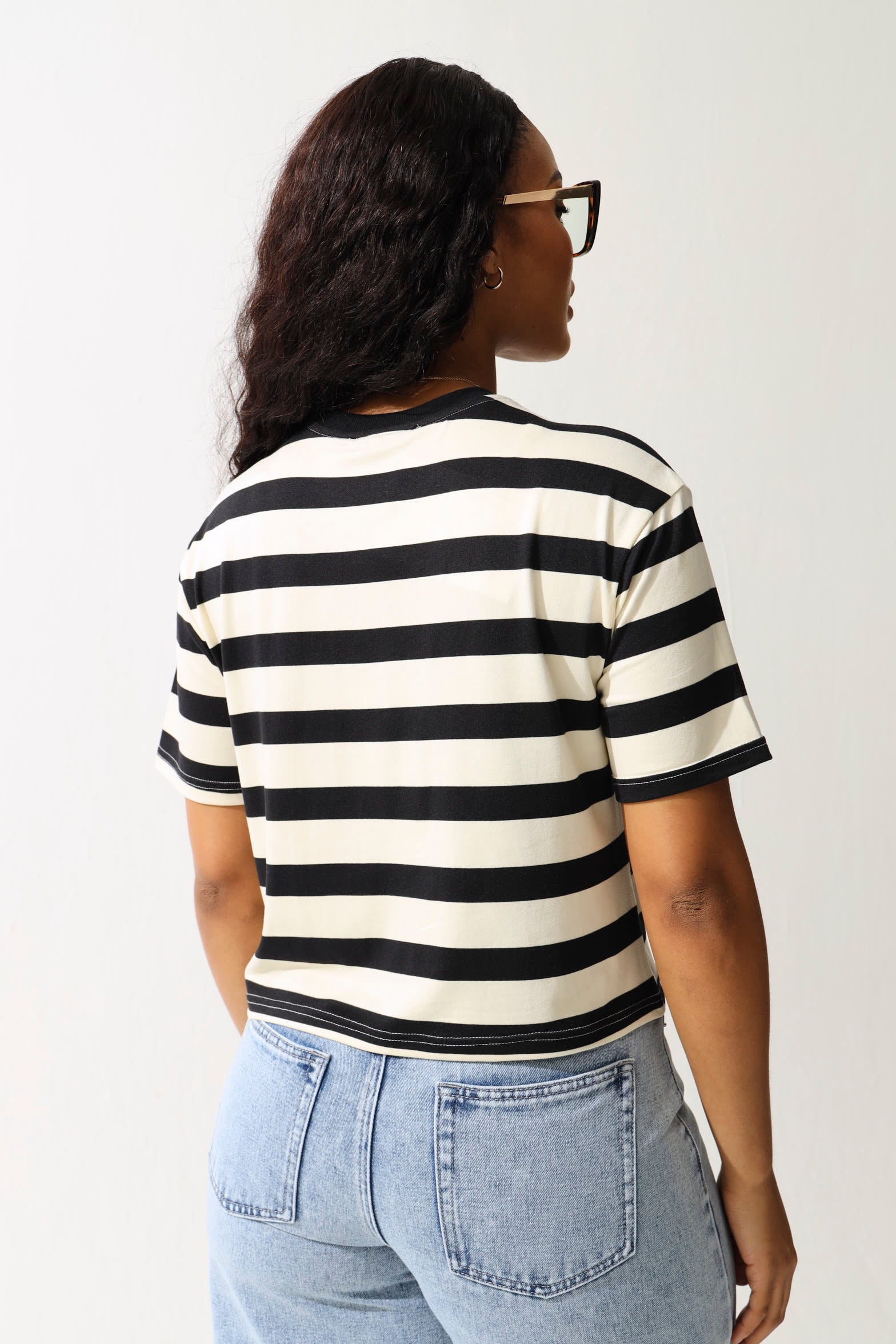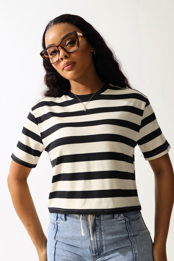 Make a bold statement with this chic wide stripe cropped tee that's equal parts fun and versatile. The classic black and beige stripes create instant visual interest, while the cropped silhouette keeps things fresh and contemporary. Dress it up with high-waisted trousers or keep it casual with your favourite denim—this wardrobe essential works harder than you'd think. Simple, stylish, and ready for anything.